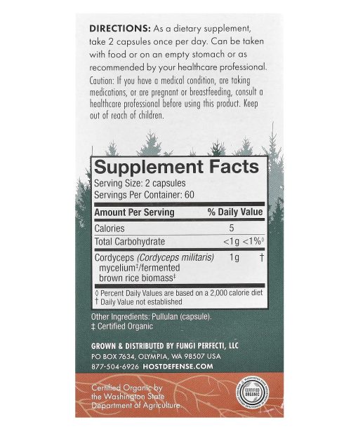 Made with Organic Mushroom MyceliumEnergy SupportDietary SupplementNon GMOCertified Organic by the Washington State Department of AgricultureGluten Free & VeganBee FriendlyPaul Stamets Fungi Perfecti, LLC#1 Best-Selling Mushroom Brand in the U.S.♦Powered By Mushroom Mycelium™Fungi Perfecti-makers of Host Defense Mushrooms-was founded by renowned mycologist Paul Stamets to build a bridge between people and fungi. We specialize in mycelium-based supplements for immune support and whole-body wellness. Sustainably grown in the USA, our mushroom mycelium is cultured on organic brown rice. Host Defense formulations are based on scientifically validated data to ensure quality and safety. Cordyceps (Cordyceps militaris)Traditionally used for strenuous, high-altitude activities, Cordyceps is known to support increased oxygen uptake, energy, stamina, and endurance levels without the crash that comes from stimulants like sugar and caffeine.Cordyceps: Supports energy, stamina, and endurancePromotes healthy respirationPromotes healthy kidney functionSupports brain health with aging Supports a balanced immune response♦Source: SPINSscan Natural / Natural Products Supermarkets > $2MM / Total US – Natural Channel / Mushrooms Ingredient Report / 52 Wks Ending 12/26/2021
