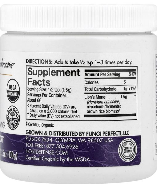 Host Defense® Mushrooms™, Lion’s Mane, Mushroom Mycelium Powder, 3.5 oz (100 g)