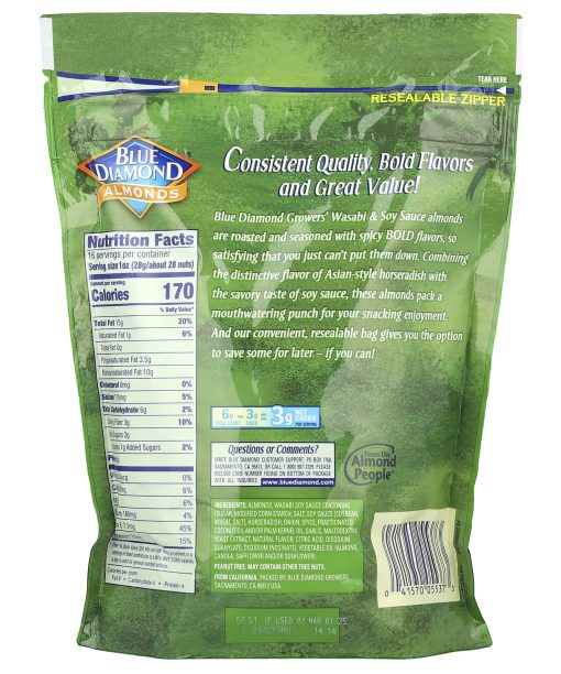 Resealable ZipperIntense Taste!Smart Snacking!™Kosher6 g Total Carbs – 3 g Fiber = 3 g Net Carbs Per ServingFrom the Almond People®Consistent Quality, Bold Flavors and Great Value!Blue Diamond Growers’ Wasabi & Soy Sauce almonds are roasted and seasoned with spicy BOLD flavors, so satisfying that you just can’t put them down. Combining the distinctive flavor of Asian-style horseradish with the savory taste of soy sauce, these almonds pack a mouthwatering punch for your snacking enjoyment. And our convenient, resealable bag gives you the option to save some for later – if you can!Scientific evidence suggests, but does not prove, that eating 1.5 ounces per day of most nuts, such as almonds, as part of a diet low in saturated fat and cholesterol may reduce the risk of heart disease.