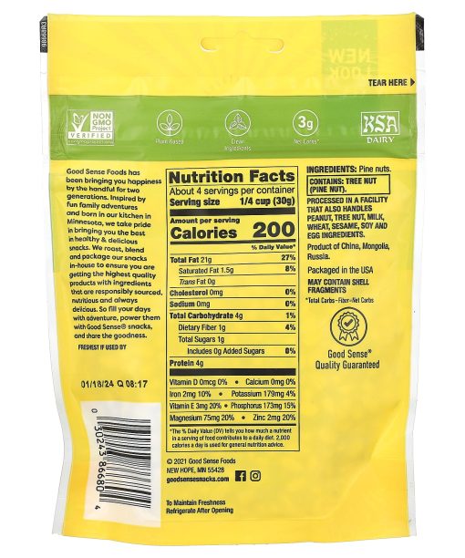 Family Owned Since 19764 g Protein Per ServingGood Source of Iron (See Back Panel for Fat Content)Non-GMO Project VerifiedPlant BasedClean Ingredients3 g Net Carbs*Kosher DairyGood Sense® Quality GuaranteedGood Sense Foods has been bringing you happiness by he handful for two generations. Inspired by fun family adventures and born in our kitchen in Minnesota, we take pride in bringing you the best in healthy & delicious snacks. We roast, blend and package our snacks in-house to ensure you are getting the highest quality products with organic ingredients that are responsibly sourced, nutritious and always delicious. So fill your days with adventure, power them with Good Sense® snacks, and share the goodness.*Total Carbs – Fiber = Net Carbs