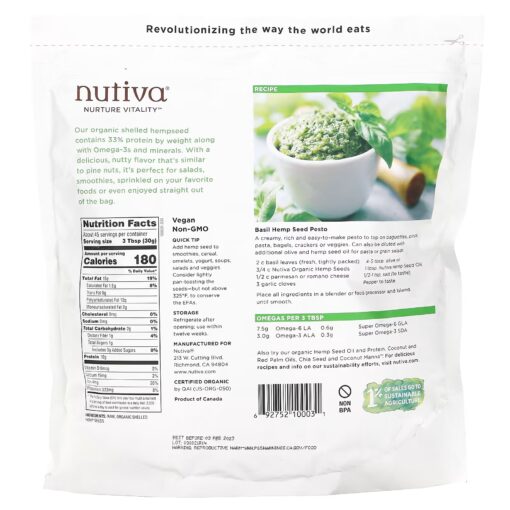 Our organic shelled hempseed contains 33% protein by weight along with Omega-3s and minerals. With a delicious, nutty flavor that’s similar to pine nuts, it’s perfect for salads, smoothies, sprinkled on your favorite foods or even enjoyed straight out of the bag.