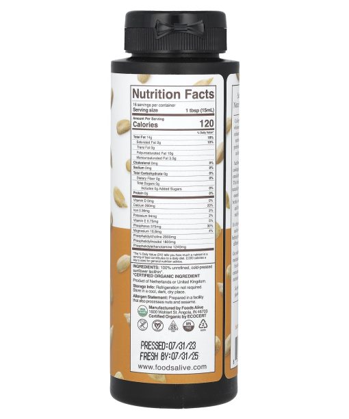 A Better Foods CompanyUSDA OrganicNaturally Occurring Phosphatidylcholine & Other PhosphatidesNon GMOGluten FreeCertified VeganBetter Food. Better YouCertified Organic by ECOCERTKosherBPA FreeSunflower Lecithin: Nature’s Healthy Emulsifier Cold-pressed sunflower lecithin is a wholesome, beneficial ingredient that enhances both culinary creations and nutritional well-being, making it a preferred choice for plant-based chefs and health-conscious consumers. Sunflower lecithin is widely used for cooking and baking due to its powerful emulsifying and antioxidant properties. This thick, pure, molasses-like liquid is naturally rich in phosphatidylcholine and essential fatty acids. Simply place the bottle in warm water for a few minutes, and this nutty-flavored lecithin will easily blend into any dish or recipe! It is the perfect all-natural, plant-based, and soy-free addition to any recipe, helping to stabilize mixtures and prevent different ingredients from separating. Our sunflower lecithin is made using a mechanical, cold-pressed, and solvent- free extraction process. This gentle extraction method guarantees the vital nutrients remain intact and preserved. So give it a try, and elevate your favorite recipes to the next level!