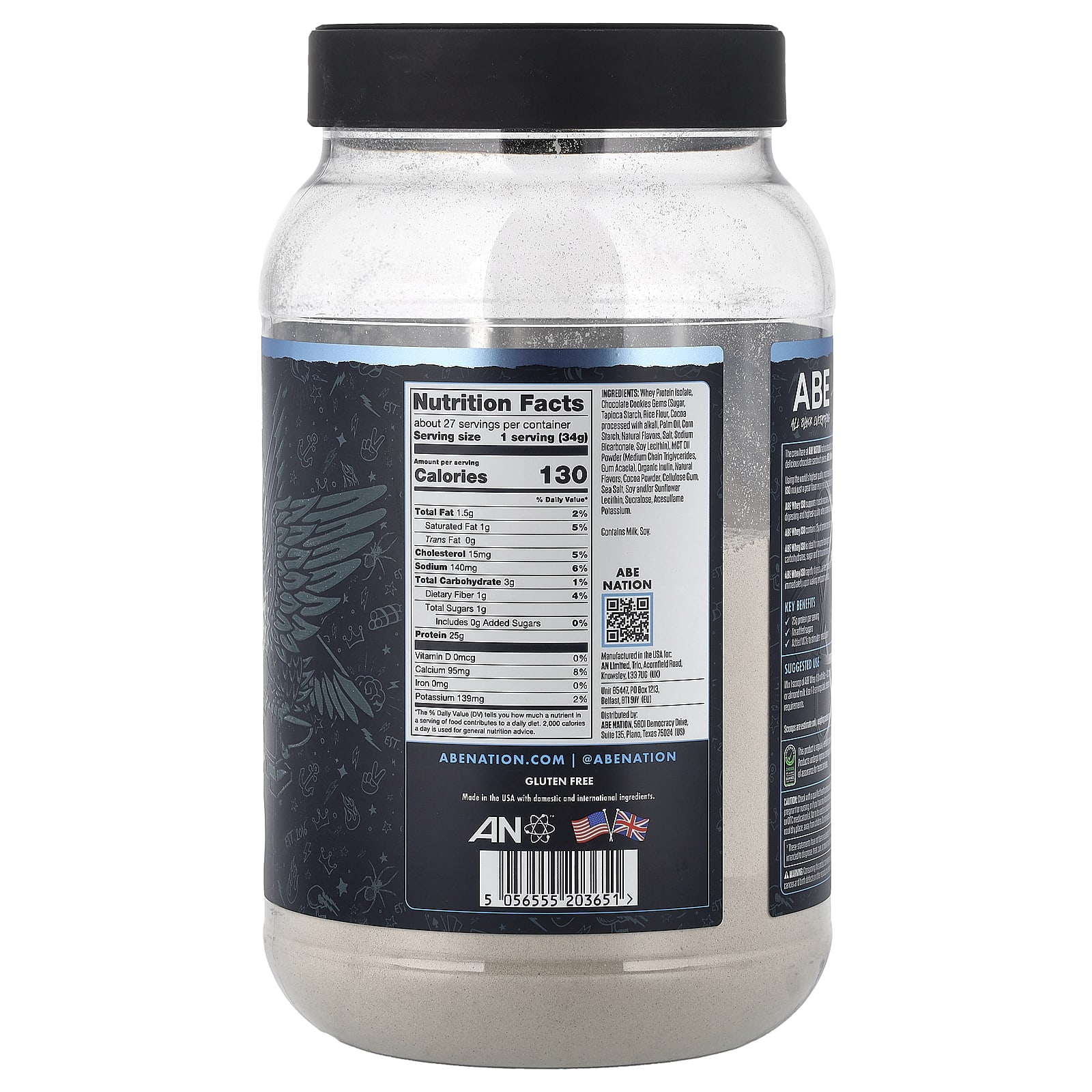 All Black EverythingAN™25 g Protein130 CaloriesZero Added SugarMCT’s Added to Stimulate MetabolismTested For Athletes100% Whey Protein IsolateDietary SupplementNatural & Artificial FlavorsInformed Choice – We Test, You TrustRegularly Tested For Banned SubstancesGluten FreeABE All Black Everything… It’s A Mindset.The crew here at ABE NATION had no interest launching a run-of-the-mill protein powder. Loaded with delicious chunks of chocolate brownie bits, ABE’s Whey ISO over-delivers on deliciousness. Using the world’s highest quality, most easily digestible whey isolate protein makes taking ABE’s Whey ISO not just a great flavor experience, but also a perfect solution for low carb and low-fat dieting. ABE Whey ISO supports muscle recovery and development with the most ultra-high-quality, rapidly digesting and highest-quality whey protein isolate powders available. ABE Whey ISO contains 25 g of protein per serving, and the flavors are absolutely PHENOMENAL. ABE Whey ISO is ideal for anyone looking to meet or increase their daily protein intake while keeping carbohydrates, sugar and fat to a minimum. ABE Whey ISO rapidly digests, so the optimal time to consume is when you need protein FAST, such as immediately upon waking and post workout.This product is regularly tested for banned substances under the Informed-Choice program. Products undergo rigorous testing at an ISO 17025 accredited lab to provide the highest level of assurance for tested athletes.