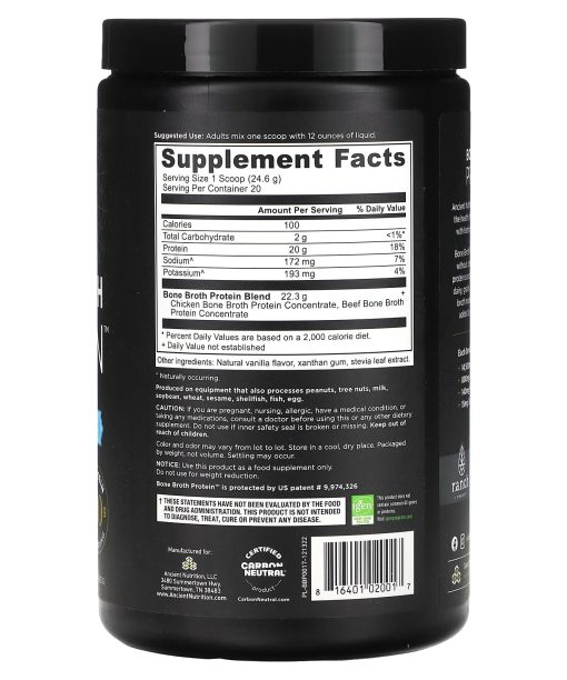 Supports a Healthy Gut, Joints and Inflammation ResponseWhole Food Dietary Supplement20 g Protein Per ServingSkinJointsPatented FormulaDairy FreeR.A.N.C.H.™ ProjectSave the World with SuperfoodsIgen™ Non-GMO TestedAncient Nutrition has one goal-to transform the health of every individual on the planet with history’s most powerful superfoods. Bone Broth Protein is Paleo friendly, made without common allergens and the ideal protein source for those who are sensitive to dairy, grains, eggs, nuts, and legumes. Bone broth made easy! Great in smoothies or added to your favorite sweet recipes. Each Serving Contains Approximately: 14,500 mg Collagen 800 mg Chondroitin 140 mg Hyaluronic Acid 15 mg Glucosamine