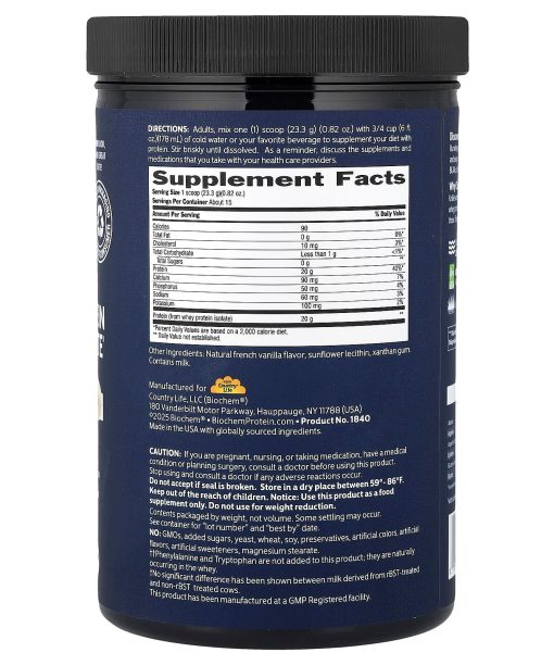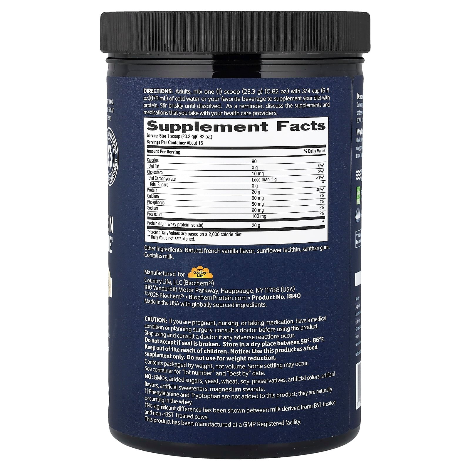Science by Nature®With Other Natural Flavors20 g Grass-Fed Vegetarian Protein Per ServingComplete Amino Acid Profile Fast AbsorbingEasily DigestibleSoy FreeCertified Gluten-Free®Protein SupplementNon GMOCertified B CorporationCertified Vegetarian – American Vegetarian Association Igen™  Non GMO TestedKeto FriendlyNo Artificial Flavors99% Lactose FreeNo rBGH, rBST†Kosher DairyDiscover the Power of Whey Protein Isolate!Our whey protein isolate is a high-quality protein source that’s fast absorbing and easy on your stomach. Packed with all nine essential amino acids and BCAAs, it helps support muscle repair and recovery.Why Choose Whey Isolate? Unlike whey protein concentrate, which has more fat, carbs and lactose, our whey protein isolate undergoes ultrafiltration and microfiltration to remove those. The result? A product that’s at least 90% pure whey protein isolate.△Biochem undergoes Ultrafiltration/Microfiltration which results in 20 grams of 100% Whey Protein Isolate△ GMO-free and does not contain common GE genes or proteins.Comes from grass-fed cows that are rBGH & rBST free††No significant difference has been shown between milk derived from rBST-treated and non-rBST treated cows. △With sunflower lecithin