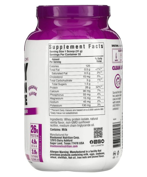 From Grass-Fed CowsMade With Non GMO IngredientsKosher DairySoy FreeGluten FreeDietary SupplementBPA FreeMuscleFuelStrengthGainRecoveryPer Serving26 g Protein4.9 g BCAA3.9 g Glutamine / Glutamic Acid Clean & Fast-Acting ProteinSourced from grass-fed, pasture-raised cows not treated with hormones (rBST/rBGH) or antibiotics.Undenatured, microfiltered whey protein isolate with important Immunoglobulins.Optimal lean muscle growth & recovery and quickly replenishes the body’s amino acid pool.