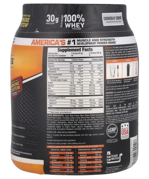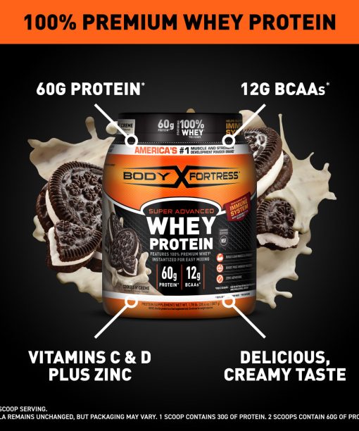 Featuring 100% WheyHelps Support Your Immune System America’s #1 Muscle and Strength Development Powder Brand**Naturally&  Artificially FlavoredFeatures 100% Premium WheyInstantized for Easy MixingProtein SupplementNSF® Contents CertifiedHelps Support Your Immune System with Vitamin C & D Plus Zinc Build Lean Muscle & StrengthBoost Post-Workout RecoveryZero Aspartame Gluten Free cGMP ManufacturedManufactured According to cGMP Standards, as is Required for all Dietary SupplementsYour Body – Your Fortress®Whey Protein For Optimal Recovery Made from 100% premium whey and instantized for easy mixing. Engineered complete protein powder for sustained energy, high digestibility and fast absorption. Body fortress® super advanced whey protein is formulated to help you replenish your body and rebuild lean muscle faster, so come tomorrow you can push even harder. Super Advanced Whey ProteinProtein and Amino Acid Profile30 g Protein*6 g BCAAs* From Protein*Body Fortress® Complete Protein Sustained EnergyHigh Digestibility Fast Absorption The Body Fortress® workout outlook You give 100% in training and body fortress® gives you 100% right back. Like you, we prefer hard work to hype. That’s why all of our products are carefully crafted with proven ingredients that will help you reach your fitness goals. Our full line of premium quality muscle building supplements will give you the power to train harder and recover faster.*Per scoops.**Source: IRI, MULO, 52 WE, Units Sold, 1/27/23, excluding online sales.