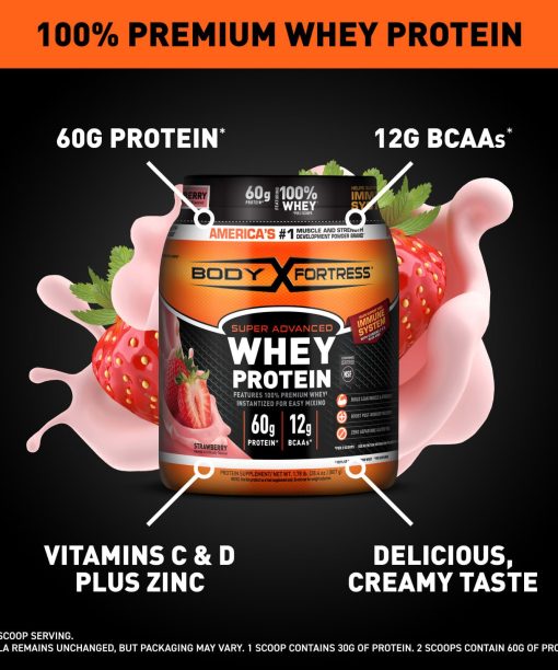 Your Body. Your Fortress®Featuring 100% WheyHelps Support Your Immune System America’s #1 Muscle and Strength Development Powder BrandNaturally Artificially FlavoredFeatures 100% Premium WheyInstantized for Easy MixingProtein SupplementNSF® Contents CertifiedHelps Support Your Immune System with Vitamin C & D Plus Zinc Build Lean Muscle & StrengthBoost Post-Workout RecoveryZero Aspartame – Gluten FreecGMP Manufactured – Manufactured According to cGMP Standards, as is Required for all Dietary SupplementsWhey Protein For Optimal Recovery Made from 100% premium whey and instantized for easy mixing. Engineered complete protein powder for sustained energy, high digestibility and fast absorption. Body fortress® super advanced whey protein is formulated to help you replenish your body and rebuild lean muscle faster, so come tomorrow you can push even harder. Super Advanced Whey ProteinProtein and Amino Acid Profile60 g Protein*12 g BCAA’s from protein*Body Fortress® Complete Protein Sustained EnergyHigh Digestibility Fast Absorption The Body Fortress® workout outlook You give 100% in training and body fortress® gives you 100% right back. Like you, we prefer hard work to hype. That’s why all of our products are carefully crafted with proven ingredients that will help you reach your fitness goals. Our full line of premium quality muscle building supplements will give you the power to train harder and recover faster.*Per 2 Scoops.