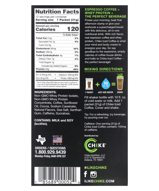 Coffee + Protein2 Espresso Shots20 g Whey Protein1 g SugarMade with Real Espresso CoffeeGluten FreeHigh ProteinLow FatNo Added SugarVegetarianNo Artificial Colors or FlavorsEspresso Coffee + Whey Protein = The Perfect BeveragePower your morning, beat that afternoon slump or give your workouts a supercharged boost with this delicious, all-in-one nutritional drink. With rich flavor, real espresso coffee, and whey protein, Chike Iced Coffee is what your mind and body craves to energize your day. So say goodbye to the expensive, empty calories of coffeehouse drinks and hello to Chike Iced Coffee – the perfect beverage!