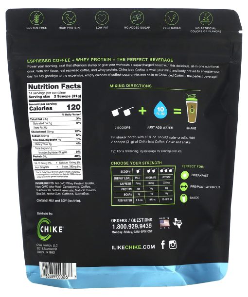 2 Espresso Shots20 g Whey Protein1 g SugarMade with Real Espresso CoffeeGluten FreeHigh ProteinLow FatNo Added SugarVegetarianNo Artificial Colors or FlavorsEspresso Coffee + Whey Protein = The Perfect BeveragePower your morning, beat that afternoon slump or give your workouts a supercharged boost with this delicious, all-in-one nutritional drink. With rich flavor, real espresso coffee, and whey protein, Chike Iced Coffee is what your mind and body craves to energize your day. So say goodbye to the expensive, empty calories of coffeehouse drinks and hello to Chike Iced Coffee – the perfect beverage!