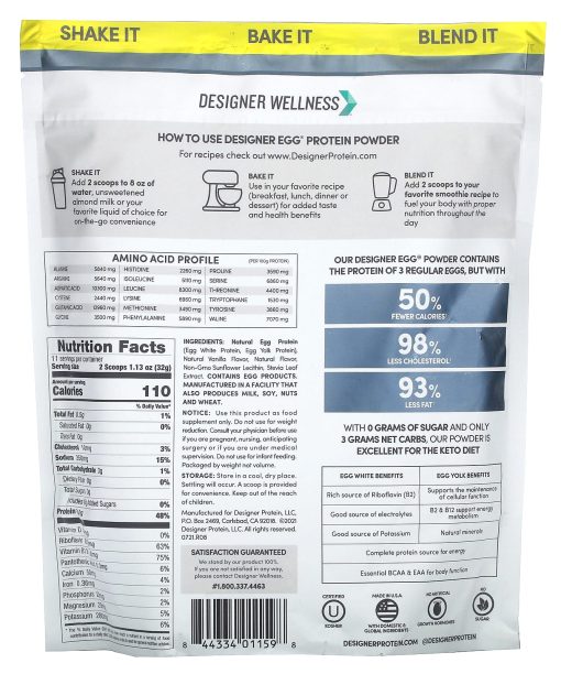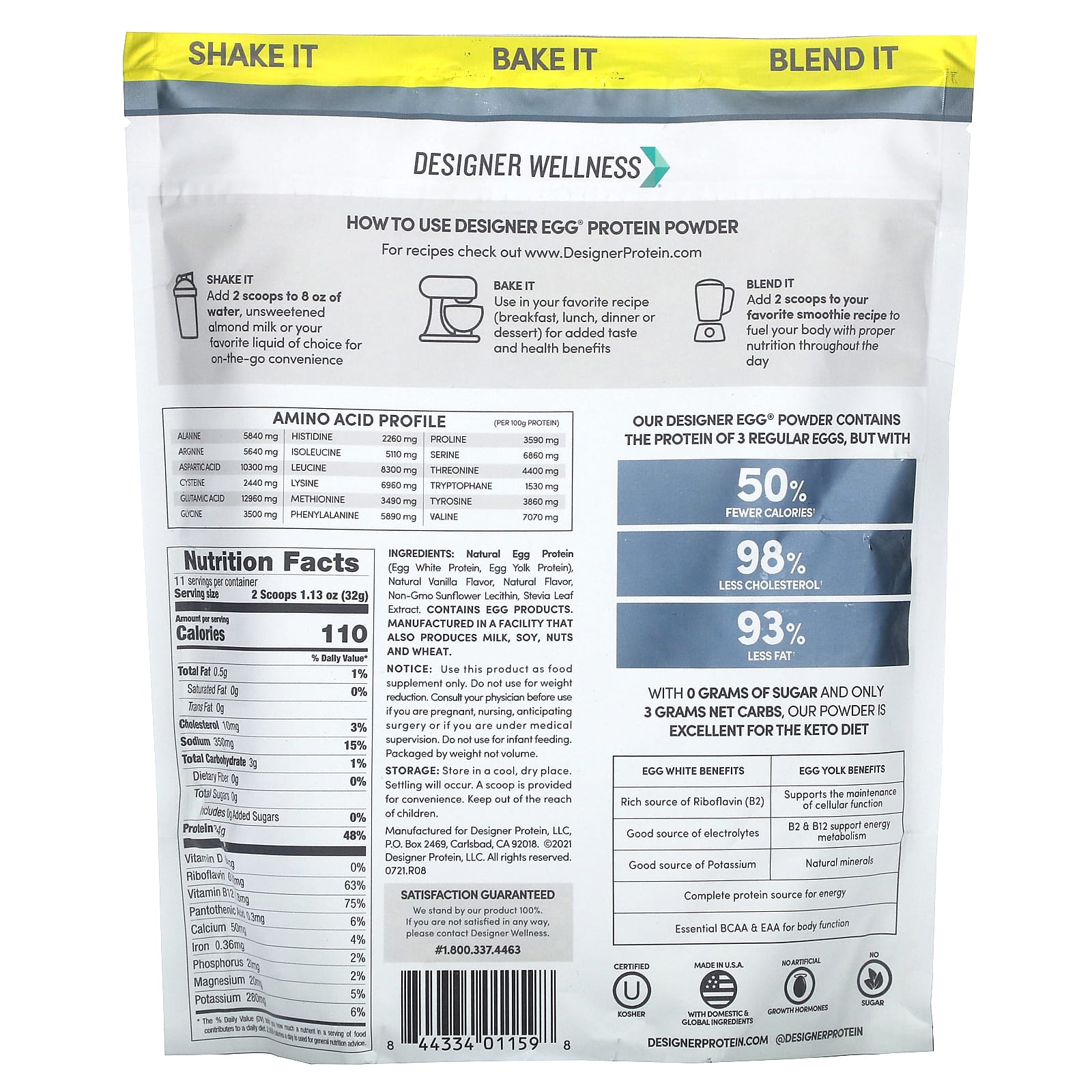 Shake It, Bake It, Blend ItNatural Vanilla Flavor24 g Protein* 0 g Sugar*†Clean Nutrition With Only 6 IngredientsWith Essential BCAA & EAARich in B2 & B12 VitaminsNo Artificial Colors, Flavors, Sweeteners or PreservativesDairy and Gluten FreeKeto & Paleo FriendlyCertified KosherNo Artificial Growth HormonesOur Designer Egg® Powder contains the protein of 3 regular eggs, but with:50% Fewer calories†98% Less cholesterol†93% Less fat†With 0 grams of sugar and only 2 grams net carbs, our powder is excellent for the keto diet.Egg white benefitsEgg yolk benefitsRich source of Riboflavin (B2)Supports the maintenance of cellular functionGood source of electrolytesB2 & B12 support energy metabolismGood source of PotassiumNatural mineralsComplete Protein source for energyEssential BCAA & EAA for body function*Per serving†Not a reduced calorie food