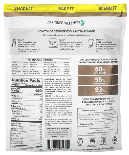 Shake It, Bake It, Blend ItNatural Chocolate Flavor24 g Protein* 0 g Sugar*†120 Calories*Clean Nutrition With Only 6 IngredientsWith Essential BCAA & EAARich in B2 & B12 VitaminsNo Artificial Colors, Flavors, Sweeteners or PreservativesDairy and Gluten FreeKeto & Paleo FriendlyCertified KosherNo Artificial Growth HormonesOur Designer Egg® Powder contains the protein of 3 regular eggs, but with:50% Fewer calories†98% Less cholesterol†93% Less fat†With 0 grams of sugar and only 2 grams net carbs, our powder is excellent for the keto diet.EGG WHITE BENEFITSEGG YOLK BENEFITSRich source of Riboflavin (B2)Supports the maintenance of cellular functionGood source of electrolytesB2 & B12 support energy metabolismGood source of PotassiumNatural mineralsComplete Protein source for energyEssential BCAA & EAA for body function*Per serving†Not a reduced calorie food