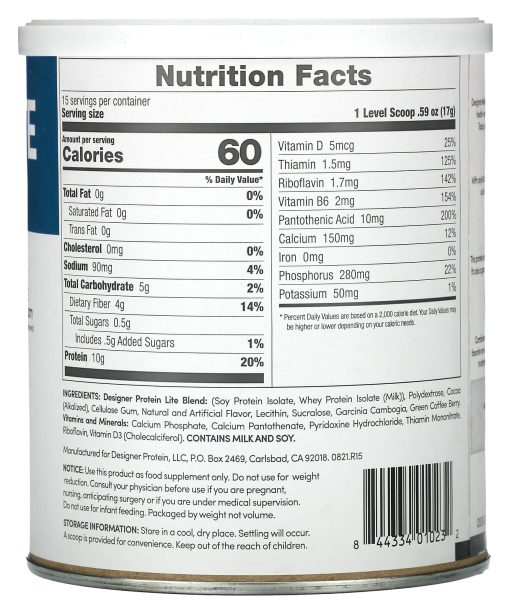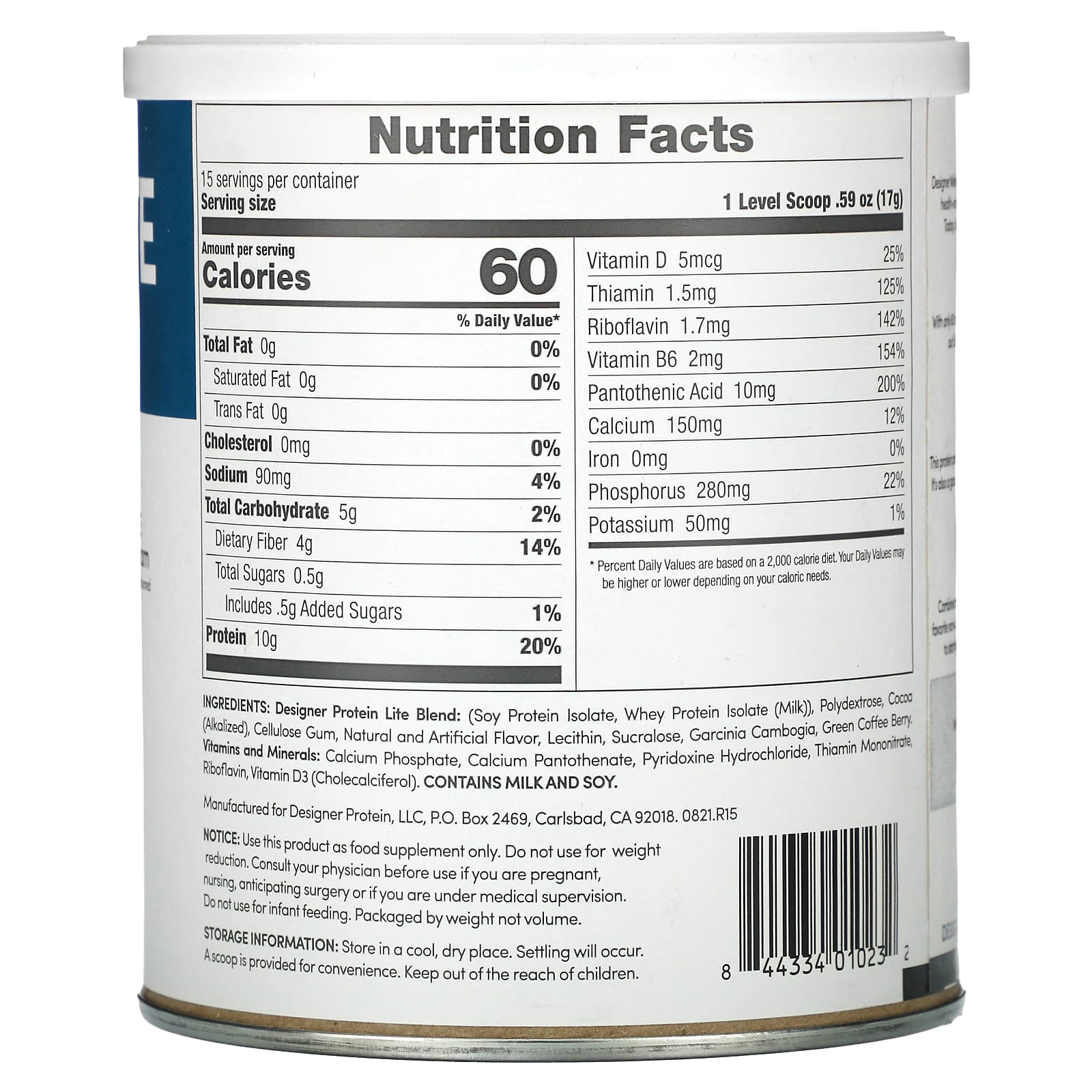 With 1 g Net CarbsNaturally & Artificially Flavored10 g Protein†<1 g Sugar†60 Calories†Protein with Green Coffee Berry and Garcinia CambogiaGluten FreeCertified Kosher Dairy Designer Wellness's diverse family of protein powders have been crafted in the health-oriented seaside community of Carlsbad, CA for over 25 years. Today, its unparalleled heritage of innovation is stronger than ever. Weight Management With only 60 calories, less than 1 gram of sugar and 0 grams of fat per serving, our Lite Protein® helps build and maintain a lean, toned body, when combined with exercise Good For Your Insides This protein powder is made with 4 grams of Prebiotic Fiber for digestive health. It's also a good source of Vitamins and Minerals, including B-Vitamins, Calcium and Vitamin D which help support bone health. †Per serving
