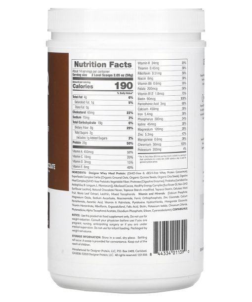 With 8 g Fiber†Natural Flavor25 g 100% Whey Protein†2 g Sugar†23 Vitamins & Minerals†Nutritionally Clean Protein for a Meal On-The-GoGluten FreeCertified Kosher DairyDesigner Wellness’s diverse family of protein powders have been crafted in the health-oriented seaside community of Carlsbad, CA for over 25 years. Today, its unparalleled heritage of innovation is stronger than ever.Balanced Macros For A Healthy MealFeatures 100% Whey Protein free from artificial growth hormones or antibiotics. Our Healthy Fats are unsaturated and come from real sunflowers. This powder also boasts Complex Carbs from Organic Superfoods with gluten-free Soluble Fiber for steady energy without spiking your blood glucose levels.Good For Your InsidesMade with 23 Vitamins and Minerals that support wellness while converting Protein, Fats and Carbs into useable energy. It also contains natural Digestive Enzymes and Probiotics that help promote healthy digestion, immunity and your overall wellness.†Per serving