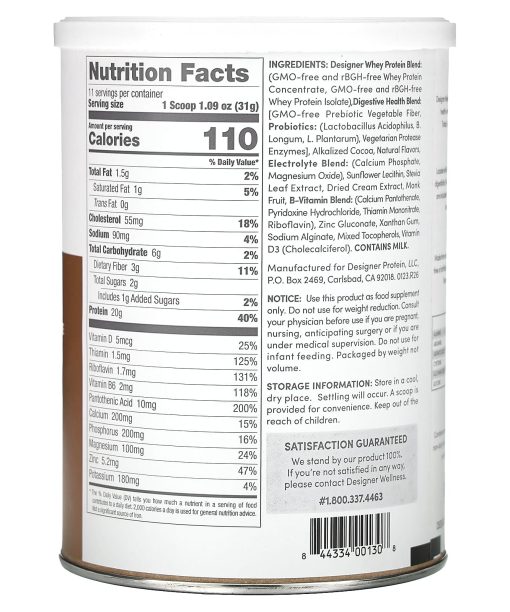 Natural 100% Whey Protein Powder*With Probiotics20 g Protein†2 g Sugar†110 Calories†Protein with More Than 100% of Key B-Vitamins for EnergyGluten FreeCertified Kosher DairyTrusted Since 1993Designer Wellness’s diverse family of protein powders have been crafted in the health-oriented seaside community of Carlsbad, CA for over 25 years. Today, its unparalleled heritage of innovation is stronger than ever. Protein-Rich Nutrition Loaded with B-Vitamins, natural plant enzymes and microbial probiotics for digestibility. Plus, calcium, vitamin D, phosphorus, magnesium and electrolytes are included to assist post-workout recovery. Zinc has been shown to aid in boosting the immune system and energy metabolism. From A Natural Source Made from natural, GMO-free whey from midwest cows cared for with a diet free of artificial growth hormones and antibiotics. There are no artificial colors, flavors, sweeteners or preservatives in our protein powder. It contains no gluten and is 93% lactose-free.†Per Serving*Natural whey protein with added nutritional benefits.
