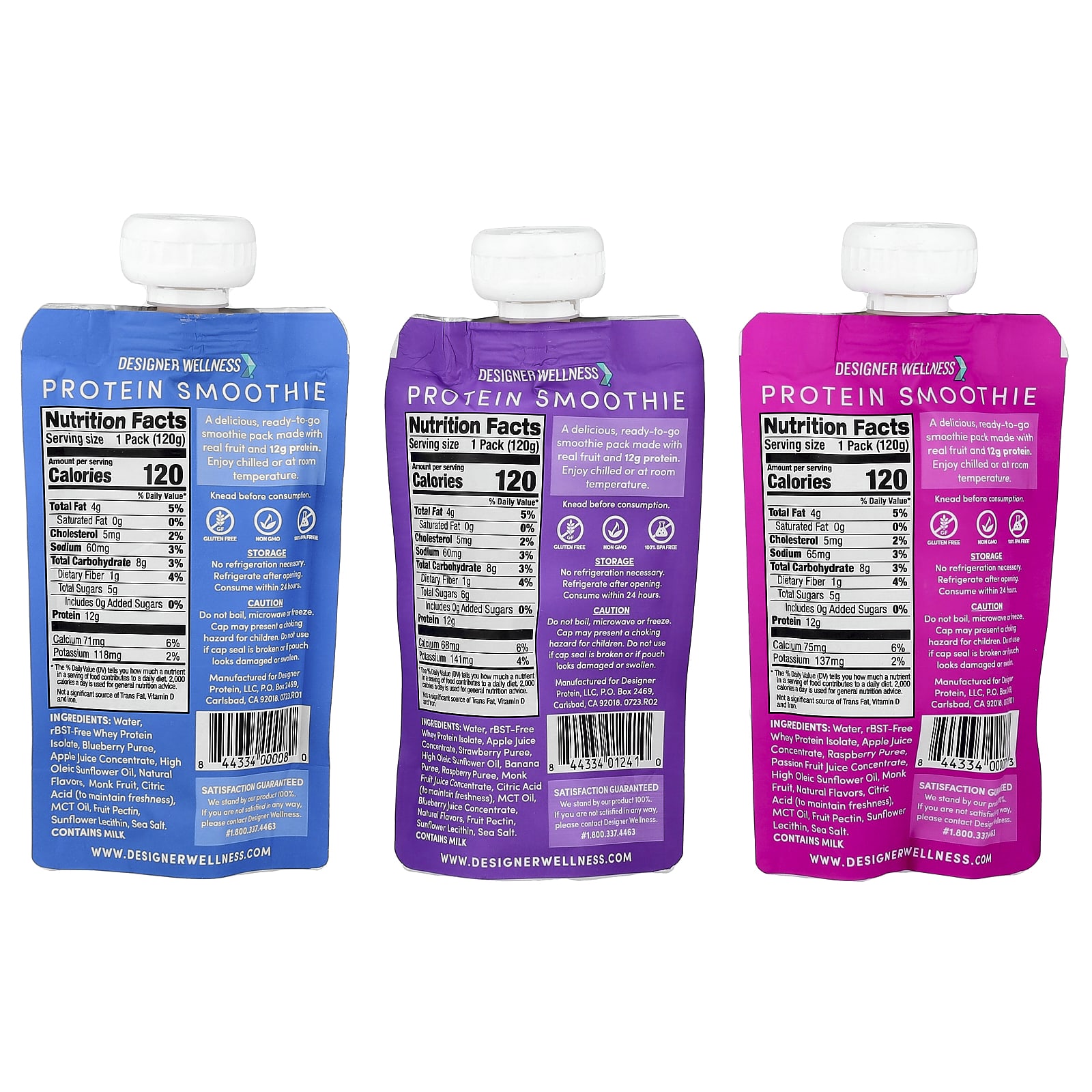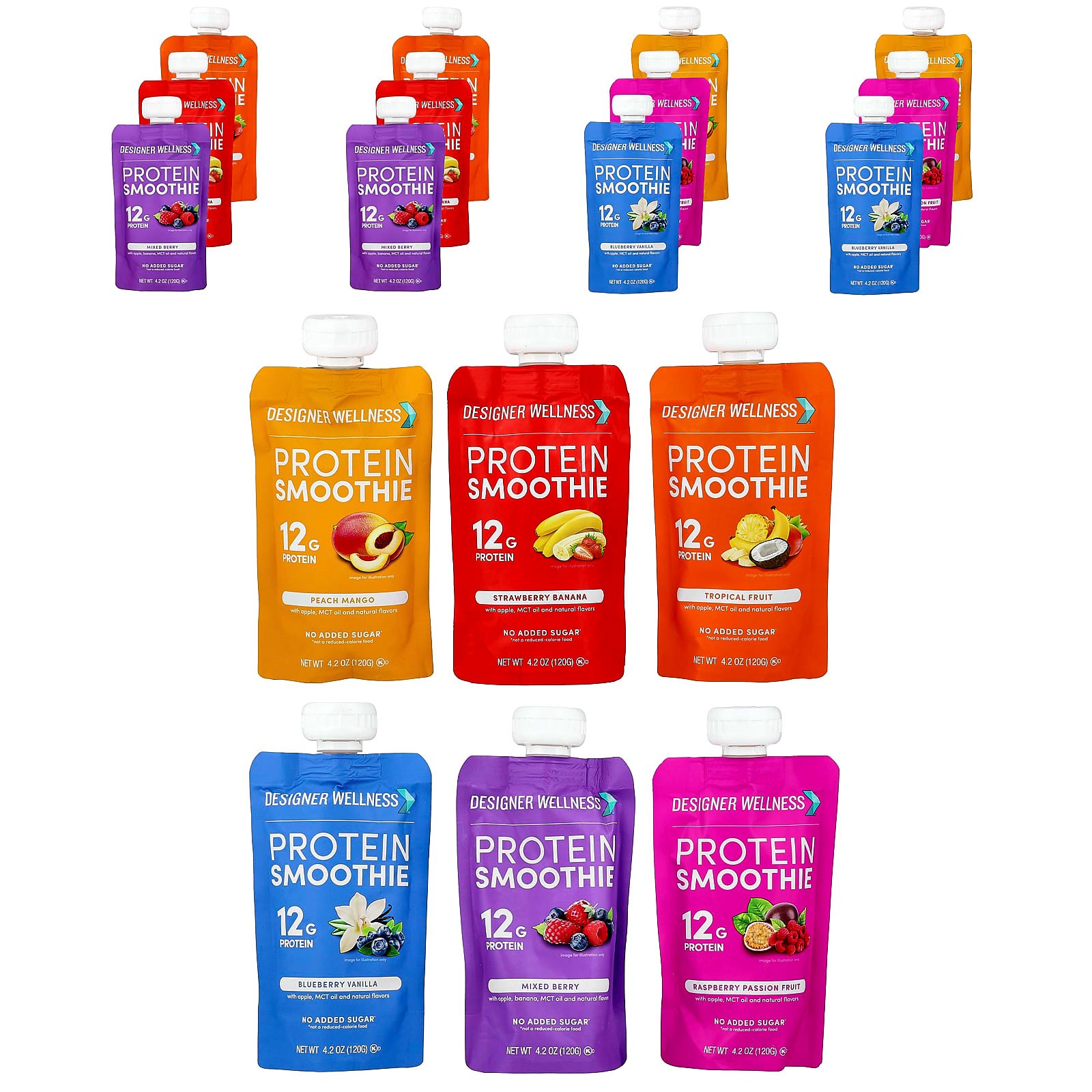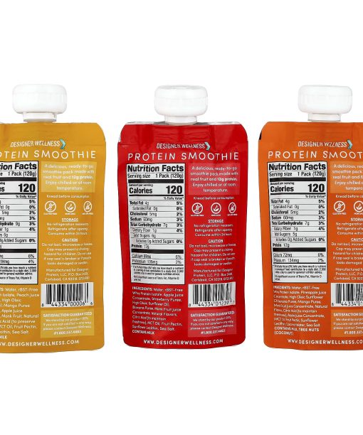 12 g ProteinNo Added Sugar*Gluten FreeNon GMO100% BPA FreeWith Apple, MCT Oil and Natural FlavorsKosher DairyContains: 2 Mixed Berry, 4.2 oz (120 g)2 Strawberry Banana, 4.2 oz (120 g)2 Tropical Fruit, 4.2 oz (120 g)2 Blueberry Vanilla, 4.2 oz (120 g)2 Raspberry Passion Fruit, 4.2 oz (120 g)2 Peach Mango, 4.2 oz (120 g)A delicious, ready-to-go smoothie pack made with real fruit and 12g protein. *Not a reduced calorie food.