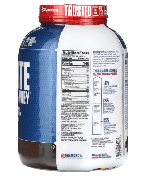 Protein 25 gBCAAs 5.5 gLeucine 2.7 gProtein Powder 100% Whey Protein*Banned Substance Tested Naturally and Artificially FlavoredGet DymatizedTrusted For Over 25 YearsTypical Amino Acid Profile**25 g Total Amino Acids Per Serving2:1:1 Ratio BCAAs 5.5 g -47% Essential Amino Acids (EAAs): 11.8 gLeucine 2.7g – Why Leucine? Leucine is the BCAA that is directly involved in activating Muscle Protein Synthesis.Other EAAs 6.3 gGlutamine † 4.4 g – 27% Conditionally Essential Amino Acids (CEAAs): 6.8 g Is Glutamine Important? Yes! Glutamine supports muscle recovery after strenuous workouts.Other CEAAs 2.4 gNon-EAAs 6.5 g – 26% Non-Essential Amino Acids (Non-EAAs): 6.5 g Why is non-essential…essential? Non-Essential amino are foundational building blocks of muscle!Informed-Choice Trusted by SportInformed-Choice is quality assurance program that certifies that all nutritional supplements and/or ingredients that bear the Informed-Choice logo have been tested for banned substances by the world class sports anti-doping lab, LGC.Amounts Per ServingProtein 25 gCalories 140Carbs 3 gFat 3 gSugar 2 gBCAAs 5.5 gLeucine 2.7 gThe anytime, anywhere, fast-digesting, fast-absorbing, 100% whey proteinWhether you’re preparing for a hard workout, recovering from intense training in the gym or simply looking to increase your protein intake, Elite 100% Whey Protein is the perfect anytime protein.Elite 100% Whey Protein flavors are developed in-house so they are delicious every time you enjoy an Elite 100% Whey Protein shake. Think of it as an indulgent, smart reward for your hard work and dedication.Packed with 25 grams of high-quality protein.Each serving of Elite 100% Whey Protein is packed with 25g of protein from high-quality, fast-digesting and absorbing whey protein, including whey protein concentrate, whey protein isolate, and whey peptides. Elite 100% Whey Protein is instantized for easy mixing ensuring that you get world-class taste and consistency from every serving.The exceptional quality of Elite 100% Whey Protein utilizes cross-flow microfiltration processing to preserve the important muscle building properties of whey protein and whey protein fractions such as alpha-lactalbumin and beta-lactoglobulin, serum albumins and immunoglobulins. Elite 100% Whey Protein is formulated by in-house research and development scientists by carefully selecting ingredients that meet our high quality standards and specifications.Real Science & QualityDymatize® proteins are formulated based on the latest science and put to the test in university studies and at elite professional training facilities. Dymatize protein powders are always manufactured in GMP and Sport Certified facilities, meaning that all ingredients and final products are rigorously tested and validated clean and safe. They are banned substance tested for athlete’s reassurance by Informed-Choice®.Dymatize Protein Ethics100% of the protein claimed per serving is derived from high-quality, pure, intact proteins. We do not amino spike.**All Amino Acids are naturally occurring in protein. Amounts are based on one serving.†Includes Glutamic Acid