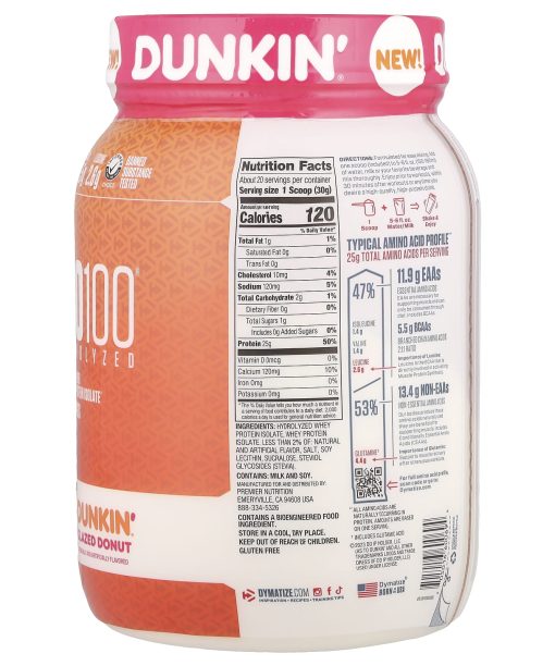 Dymatize, ISO100® Hydrolyzed, 100% Whey Protein Isolate, Dunkin® Glazed Donut, 1.34 lb (610 g)