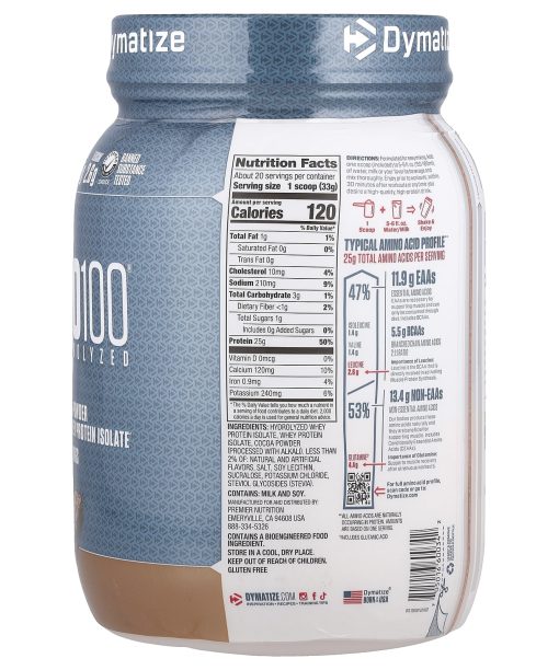 Protein 25 gBCAAs 5.5 gLeucine 2.6 gInformed Choice – We Test You TrustBanned Substance TestedProtein PowderNaturally and Artificially FlavoredGluten FreeGet Dymatized®Typical Amino Acid Profile**25 g Total Amino Acids Per Serving47% Essential Amino Acids (EAAs): 11.9 gEAAs are necessary for supporting muscle and can only be consumed through diet. Includes BCAAS.Isoleucine 1.4 gValine 1.4 gLeucine – 2.6 g – Importance of Leucine: Leucine is the BCAA that is directly involved in activating Muscle Protein Synthesis.5.5 g BCAAs: Branched chain amino acids 2:1:1 ratio53% Non-Essential Amino Acids (Non-EAAs): 13.4 g Non-EAAsOur bodies produce these amino acids naturally and they are beneficial for supporting muscle. Includes Conditionally Essential Amino Acids (CEAAs).Glutamine† 4.4 g: Importance of Glutamine: Supports muscle recovery after strenuous workoutsInformed Choice® is a quality assurance program that certifies that all nutritional supplements that bear the Informed Choice logo have been regularly tested for banned substances by the world class sports anti-doping lab, LGC.Ultra-Fast Absorbing Performance Protein IS0100® is ideal for those trying to maintain lower body fat, fuel athletic performance, and build lean muscle with a fitness or bodybuilding regimen.Dymatize, the trusted leader in athletic nutrition for over 25 years, brings you IS0100 Hydrolyzed, 100% Whey Protein Isolate.^ Each ultra-fast absorbing and easy digesting serving is scientifically formulated to deliver the protein and amino acids you need for next-level muscle recovery and performance.Engineered to Crush Goals:Building Muscle‡Muscle Recovery‡Muscle Maintenance‡The Science Behind the ScoopMulti-Step PurificationFatSugarLactoseWhey Protein IsolateISO100’s proteins are filtered to remove excess carbs, cholesterol, fat, sugar, and lactose.Hydrolyzed = Ultra-Fast AbsorbingProteinPeptideISO100’s Hydrolyzed Whey Protein Isolate is broken down into smaller protein molecules (peptides).Super Easy Mixing Mixes completely, even if you use a cup and spoon! Tested For Purity & Banned Substance Tested Our products are banned substance tested and rigorously tested for quality and purity.^100% of the protein from whey protein isolate. **All amino acids are naturally occurring in protein. Amounts are based on one serving. †Includes glutamic acid‡With a fitness or bodybuilding regimen
