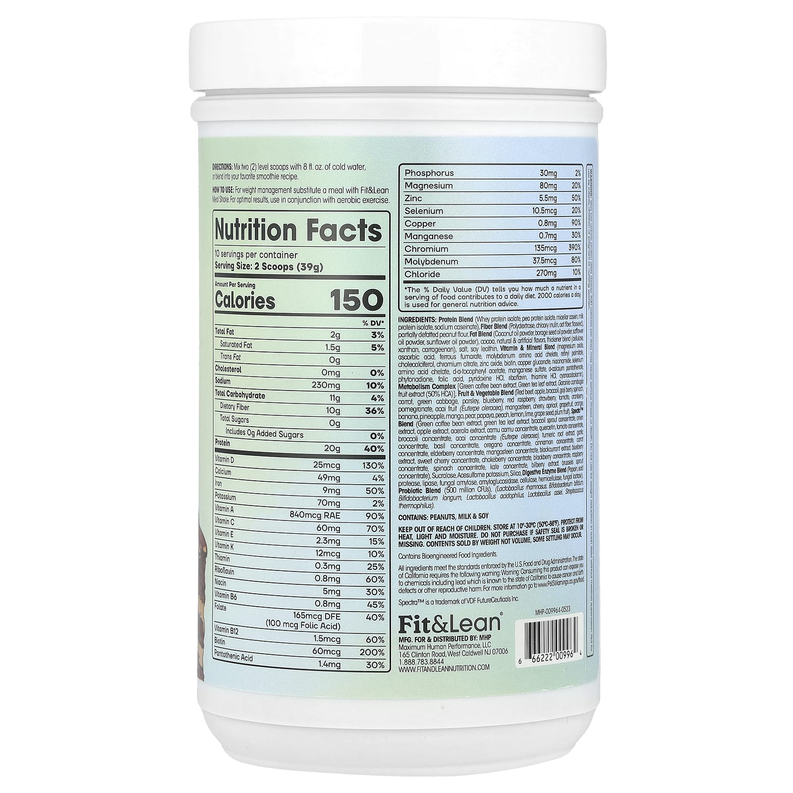 Make Fit Happen 20 g Protein30 Fruits & Vegetables 500M CFU Probiotics 26 Vitamins & MineralsGluten Free10 g Fiber Naturally and Artificially FlavoredContains No Added Sugar, and Tastes DeliciousDiscover Meal Shake Supports metabolism & weight loss Promotes lean muscle & recovery Improves digestion & gut health Reduces hunger & cravings Fit&Lean® Meal Shake is formulated to provide the key nutrients your body needs to help boost metabolism, support energy and improve performance. Plus, this delicious shake will help keep you feeling full and satisfied during the day. Each serving provides 20 g protein and is fortified with vitamins and minerals, fruits, vegetables, fiber and probiotics, making it the perfect fit for a healthy diet plan.