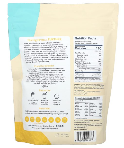 20 g ProteinWith Other Natural Flavors8 Simple IngredientsNo GMOS, No Sugar, No Gluten, No DairyNo Soy, No Gums, No Artificial SweetenersUSDA OrganicKeto & PaleoSugar Free*Third Party TestedA Women and Minority-Owned BusinessCertified Organic by QAITaking Protein FurtherPower up with plants. Made with only six simple ingredients, our organic pea protein contains three potent mushrooms and seaweed to feed your body and your mind. The addition of seaweed – a staple of Asian cuisine – draws from our traditional Eastern roots and provides many nutritional minerals and trace elements not often found in Western diets. Unflavored and with no sweeteners added, this delicious protein powder is ready to be mixed into anything. Give your body the boost it deserves. No junk. No fillers. Ever.From Our Founder Growing up, the comforting simmer of my mother’s bone broth, filled with traditional Chinese herbs, was a daily reminder that to her, food was the best medicine. Today, I carry that legacy with me at Further Food. Working with doctors and dieticians, we combine the healing practices of Eastern medicine with modern science to create products that nourish your body and take you further. -Lillian*Not a low-calorie food.
