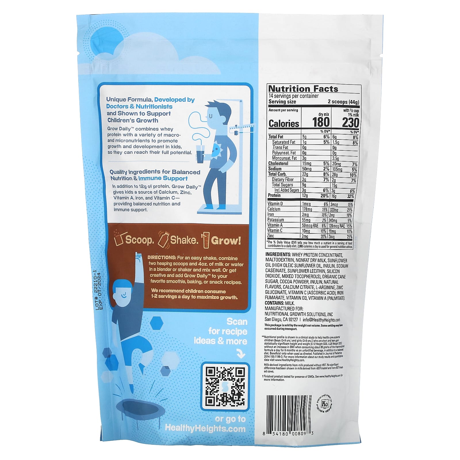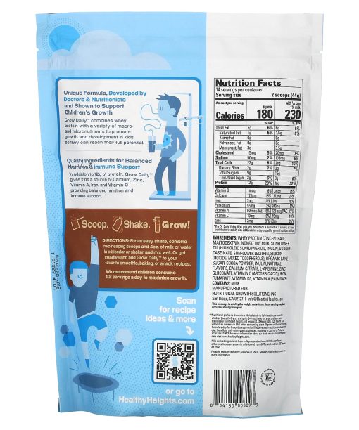 No GMOs†Immune SupportResearched & Developed by Doctors + NutritionistsClinically Studied Formula Supporting Children’s Growth**Excellent Source of Protein 12 g Per ServingFree from Corn Syrup, Gluten, Soy, Peanuts, Artificial Flavors & ColorsGreat-TastingKosherUnique formula, developed by doctors & nutritionists and shown to support children’s growth.Growth Grow Daily™” combines whey protein with a variety of macro- and micronutrients to promote growth and development in kids, so they can reach their full potential.Quality ingredients for balanced nutrition & immune support.In addition to 12 g of protein, Grow Daily™ gives kids a source of Calcium, Zinc, Vitamin A, iron, and Vitamin C — providing balanced nutrition and immune support.** Nutritional profile is shown in a clinical study to help healthy pre-pubertal children [boys (3-9 yrs.) and girls (3-8 yrs.)] who are short and lean pain statistically significant height and weight [0.12 Height SDS, 0.28 Weight SDS] without an increase in BMI when consuming about 88 grams of the macronutrient formula a day for 6 months vs an unfortified beverage, in addition to a beanest diet. Beneficial only when used as directed. Published in Journal of Pediatrics 2014:165:1190-3.  Milk-derived ingredients from milk produced without rBST. No significant difference has been shown in milk derived from rBST-treated and non-rBST-treated cows.†Finished product tested for presence of GMOs.