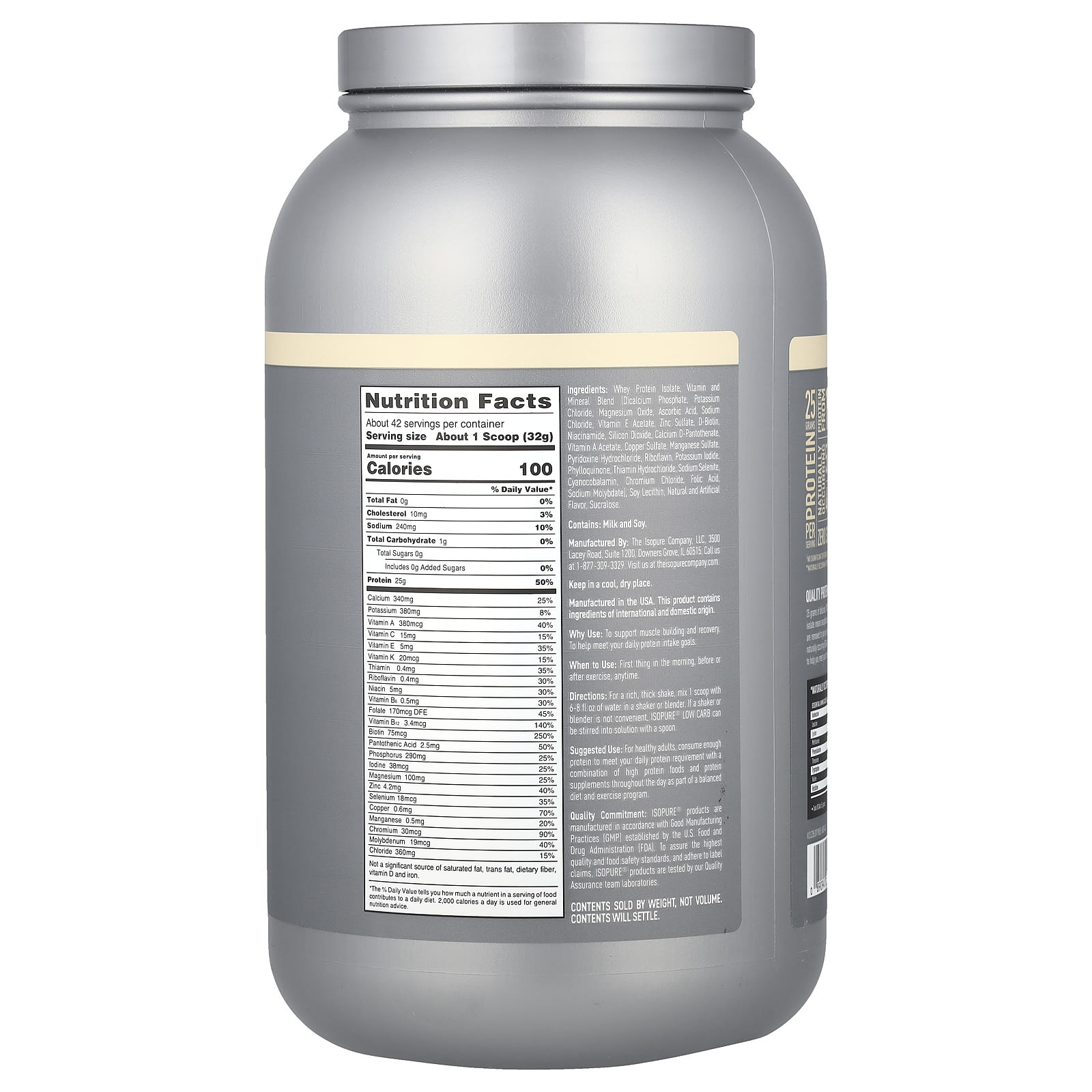 Artificially FlavoredAdded Vitamin & Mineral BlendWith 25 Grams of Protein From 100% Whey Protein IsolateProtein From 100% Whey Protein IsolateNaturally Occurring 5.5 Grams BCAAs Per Serving*4.6 g Glutamine Per Serving*Zero Sugar*rBST Free† Whey | Low CarbGluten & Lactose FreeQuality Protein. Low Carbs. Pure Results.25 grams of delicious 100% pure, eBST free’, whey protein isolate that’s low on the carbs. 100% whey protein isolate means exceptional purity and quality: excess fat, cholesterol, sugars, carbs, lactose and other fillers are removed to give you everything you need and nothing you don’t. And each serving delivers 5.5 grams of naturally occurring BCAAS, 4 grams of naturally occurring glutamine and an added vitamin and mineral blend to help you meet your micronutrient needs. Why Use: To support muscle building and recovery. To help meet your daily protein intake goals. †No significant difference has been found between milk derived from rbst-treated and non-rbst treated cows. *Naturally occurring from whey protein / *Not a low calorie food.
