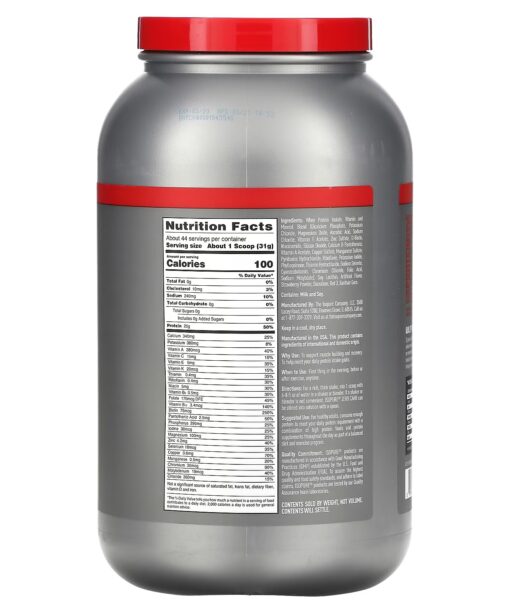 Whey protein isolate, vitamin and mineral blend (dicalcium phosphate, potassium chloride, magnesium oxide, ascorbic acid, sodium chloride, vitamin E acetate, zinc sulfate, d-biotin, niacinamide, silicon dioxide, calcium d-pantothenate, vitamin A acetate, copper sulfate, manganese sulfate, pyridoxine hydrochloride, riboflavin, potassium iodide, phylloquinone, thiamin hydrochloride, sodium selenite, cyanocobalamin, chromium chloride, folic acid, sodium molybdate), soy lecithin, artificial flavor, strawberry powder, sucralose, red 3, xanthan gum.