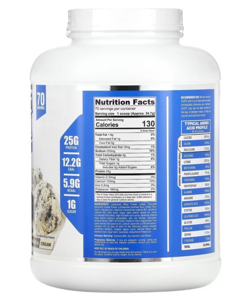 Instantized whey protein isolate, chocolate sandwich cookie pieces [unbleached enriched flour (wheat flour, niacin, reduced iron, thiamine mononitrate (vitamin B1), riboflavin (vitamin B2), folic acid), sugar, palm and/or canola oil, cocoa (processed with alkali), high fructose corn syrup, leavening (baking soda and/or calcium phosphate), salt, soy lecithin, chocolate, artificial flavor], mct oil powder [medium chain triglycerides from (palm kernel and coconut oil), sodium caseinate (a milk derivative), contains 2% or less of each of the following: silicon dioxide, sunflower lecithin], organic agave inulin, natural flavor, salt, xanthan gum, guar gum, sucralose, acesulfame potassium.