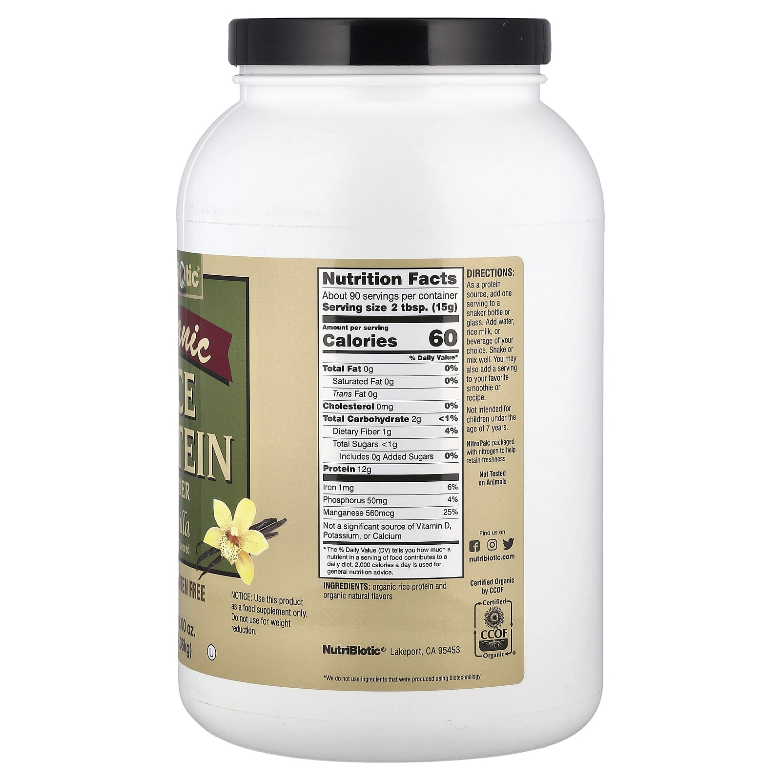 Naturally FlavoredUSDA OrganicVeganGluten FreeCertified KosherNot Tested on AnimalsCertified Organic by CCOFGMO Free*NutriBiotic® Organic Rice Protein is an excellent source of high quality, vegan protein powder providing an extensive array of naturally occurring amino acids, the building blocks of protein.Boost your nutrition and energy with this wholesome, protein formula!NutriBiotic Organic Rice Protein is produced by means of a unique enzyme process. A proprietary blend of plant enzymes is used to separate the fiber and carbohydrates from the protein portion of the whole grain, brown rice. Due to the enzyme process, color, taste, and texture may vary. NutriBiotic Rice Protein is made without artificial flavors, artificial sweeteners, artificial colors, chemicals, pesticides, herbicides, PCBs, MSG, preservatives, milk, eggs, soy, yeast, wheat, corn, and nuts.NitroPak: packaged with nitrogen to help retain freshness.*We do not use ingredients that were produced using biotechnology.