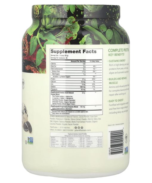 Certified VeganDairy FreeGluten FreeNon-GMO21 g Plant Protein2 g Carbs120 CaloriesNaturally FlavoredDietary SupplementKosherNon GMO Project Verified More Than Nutrition. We’re Complete Nourishment.At PlantFusion, we are obsessed with offering authentic, 100% plant-based, nutrient-dense products that delight the senses. This fusion of unique ingredients and flavors provides complete nourishment.The Plant Fusion DifferenceFlavor Pure™- A fusion of amazing taste and textureSelect Source™ – Hand selecting the best ingredientsPurity Promise™ – Transparency through every stepComplete Protein Key BenefitsSustains Energy – Rich in high-density plant-based proteins from peas, artichokes, algae and sprouted superfoodsBuilds And Repairs Muscle – Amino acid infused protein blend for complete balance and muscle repair after working outEasy To Digest – Fortified with digestive enzymes and free from major allergens including dairy, soy and gluten