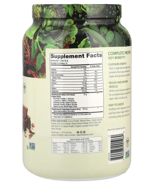 Certified VeganDairy FreeGluten FreeNon-GMO21 g Plant Protein2 g Carbs120 CaloriesNaturally FlavoredDietary SupplementKosherNon GMO Project VerifiedMore Than Nutrition. We’re Complete Nourishment.At PlantFusion, we are obsessed with offering authentic, 100% plant-based, nutrient-dense products that delight the senses. This fusion of unique ingredients and flavors provides complete nourishment.The Plant Fusion Difference Flavor Pure™ – A fusion of amazing taste and texture.Select Source™ – Hand selecting the best ingredients.Purity Promise™ – Transparency through every step.Complete Protein Key Benefits Sustains Energy – Rich in high density plant-based proteins from peas, artichokes, algae and sprouted superfoods.Builds and Repairs Muscle – Amino acid infused protein blend for complete balance and muscle repair after working out.Easy to Digest – Fortified with digestive enzymes and free from major allergens including dairy, soy and gluten