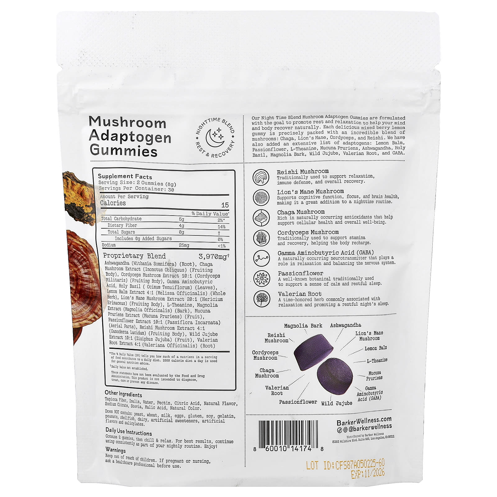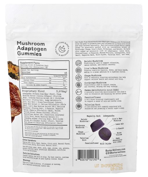 Barker Wellness Co, Nighttime Blend, Mushroom Adaptogen Gummies, Mixed Berry Lemon, 60 Gummies