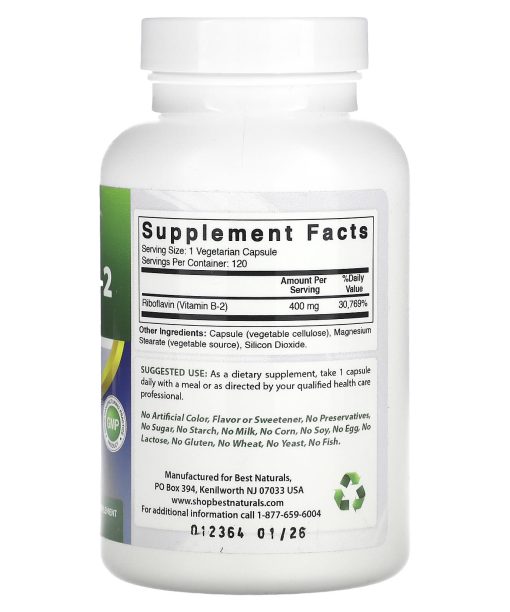 Best Naturals, Vitamin B-2 (Riboflavin), 400 mg, 120 Vegetarian Capsules