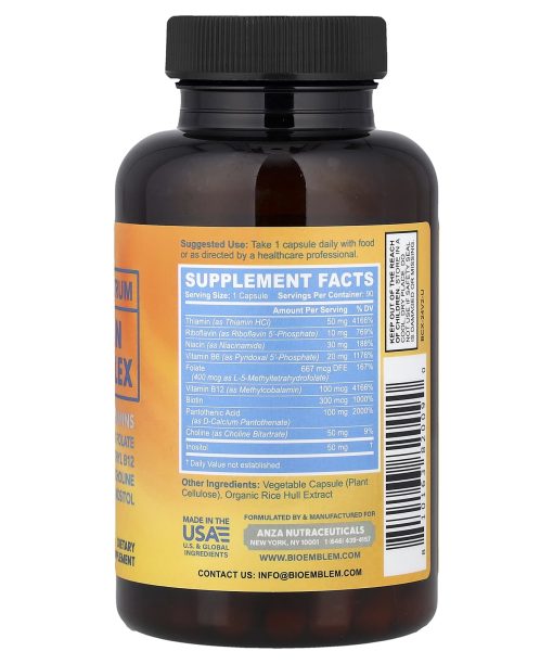 Non GMOFull SpectrumActive FormsAll 8 B-VitaminsMethyl FolateMethyl B12CholineInositolDietary SupplementLab TestedcGMP Certified FacilityGluten FreeVeganHelps SupportImmune SystemEnergy ProductionCognitive FunctionNerve FunctionSkin, Hair & NailsHeart HealthThe BioEmblem MantraNature’s best ingredients in mindfully crafted formulas for a more radiant life.