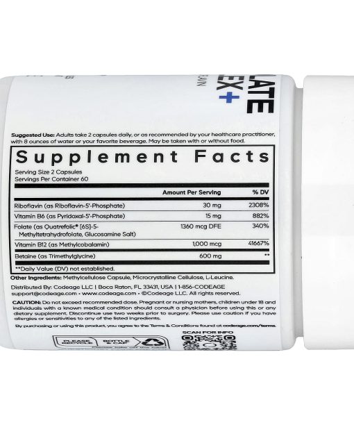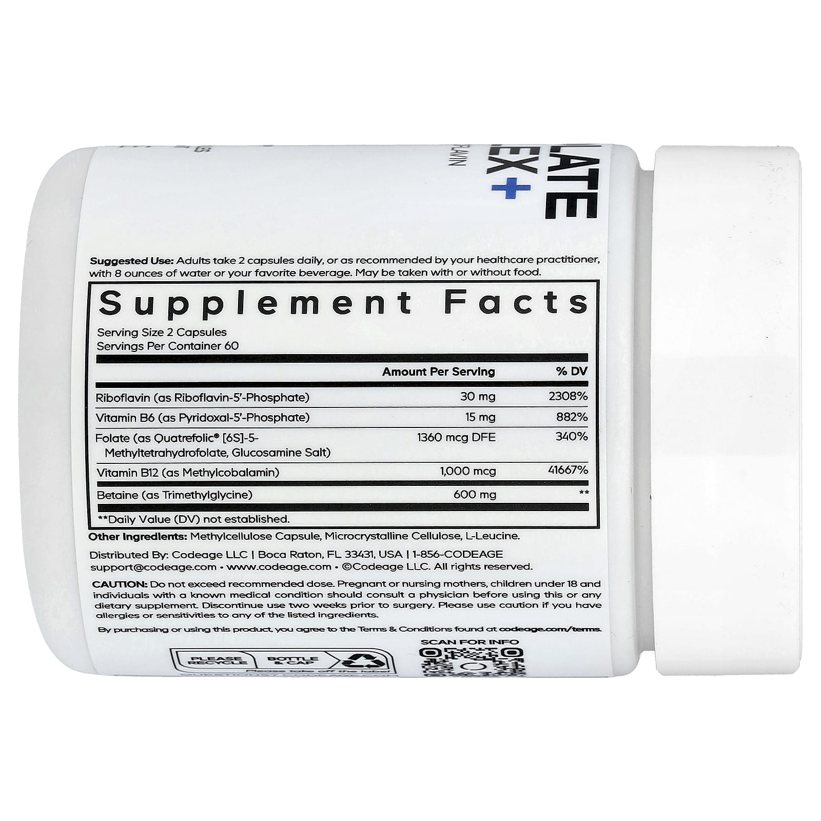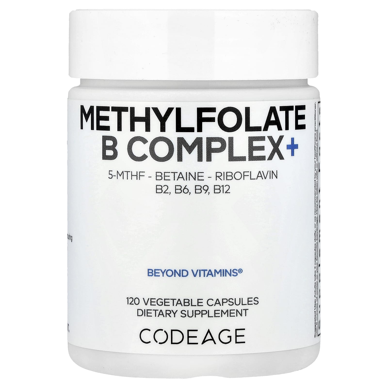 5-MTHFBetaineRiboflavinB2, B6, B9, B12Beyond Vitamins®Dietary SupplementB-ComplexQuatrefolic®MethylcobalaminNon-GMOSoy-FreeDairy FreeGluten FreecGMP Certified ManufacturingFeel DifferentCodeage Methylfolate B Complex+ offers a blend of folate as 5-MTHF, riboflavin vitamin B2, vitamin B6, vitamin B12 in its methylated form, and betaine for a comprehensive vitamin B complex formula. 2-month supply.Codeage Methylfolate B Complex+ formula boasts 1360 mcg of folate vitamins as 5-MTHF folate per serving, using Quatrefolic® 5 methylfolate and glucosamine salt.This advanced formula also features Riboflavin (30 mg Riboflavin 5’-Phosphate – vitamin B2), 15 mg of vitamin B6, and 1000 mcg of vitamin B12 methylcobalamin per serving. These vitamins B2, B6, and B12 offer a comprehensive B vitamin combination.These methylated vitamins harmoniously combine 600 mg of betaine (trimethylglycine TMG) with Vitamins B6 and B12 in their superior phosphorylated forms.