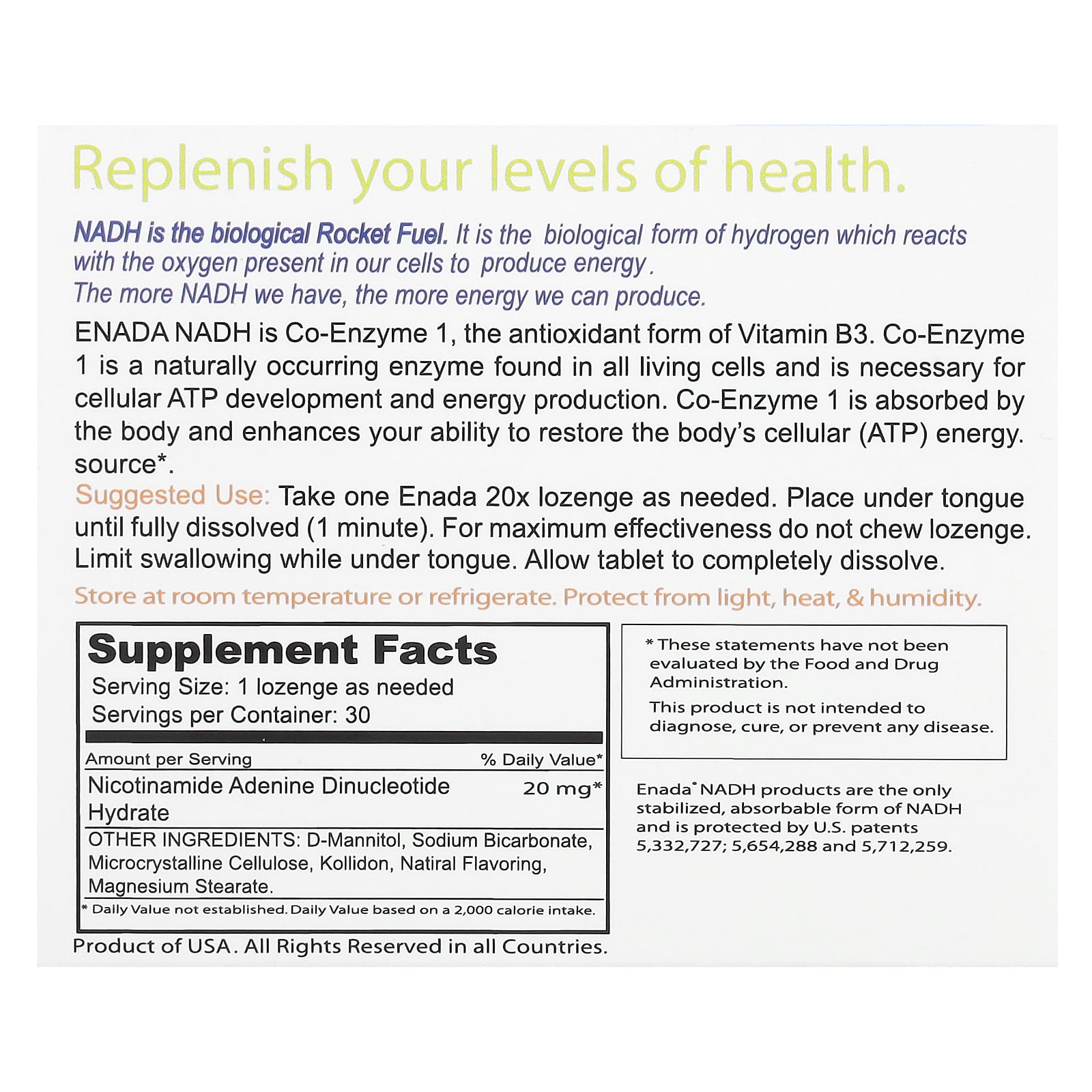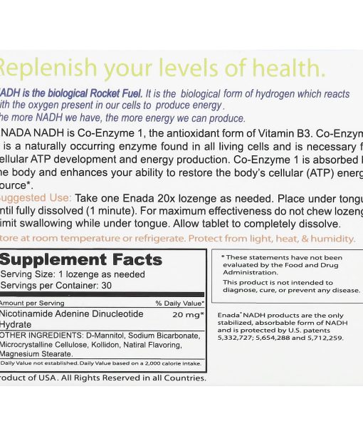 Dietary SupplementReturn to HealthEnergyStaminaFocusAlertness NADH Body Technology Be Greater Guaranteed for Purity, Freshness and Potency Replenish your levels of health.NADH is the biological rocket fuel. It is the biological form of hydrogen which reacts with the oxygen present in our cells to produce energy. The more NADH we have, the more energy we can produce. ENADA NADH is Co-Enzyme1, the antioxidant form of Vitamin B3. Co-Enzyme 1 is a naturally occurring enzyme found in all living cells and is necessary for cellular ATP development and energy production. Co-Enzyme 1 is absorbed by the body and enhances your ability to restore the body’s cellular (ATP) energy source.