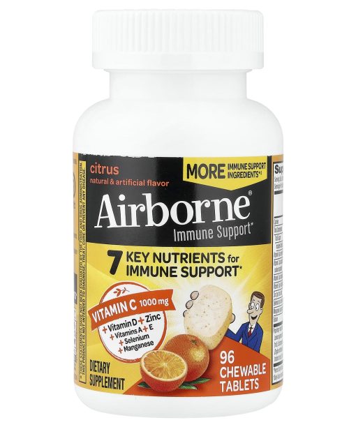 With Other Natural & Artificial Flavors Helps Support Your Immune System Crafted BlendVitamin C and 13 Vitamins, Minerals & Herbs No Water NeededHealth · Hygiene · HomeOur Story Developed by a former school teacher, Airborne® products are a specially crafted blend of vitamins, minerals, & herbs designed to help support your immune system. A Crafted Blend You Can Trust4 Chewable Tablets= 1,000 mg of Vitamin C High in Antioxidants (Vitamins A, C & E) Excellent Source of Zinc & Selenium Original Herbal Blend including Echinacea & Ginger Gluten Free