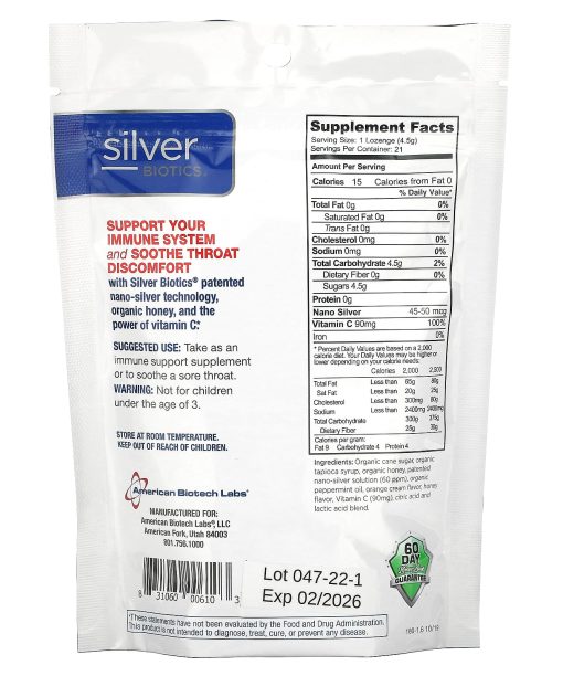 American Biotech Labs, Silver Biotics, Silver Lozenges with Vitamin C, Orange Splash, 21 Lozenges, 3 oz (85 g)