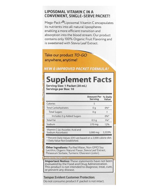 Liposomal Vitamin C In a Convenient Single-Serve Packet!3000 mg / Serving Liposomal Technology®Dietary Supplement Vida Lifescience®Mega-Pack+Liposomal Vitamin C encapsulates its nutrients into all-natural lipospheres enabling a more efficient transition and absorption into the blood stream. Our product contains only 100% Organic Fruit Flavoring and is sweetened with Stevia Leaf Extract.