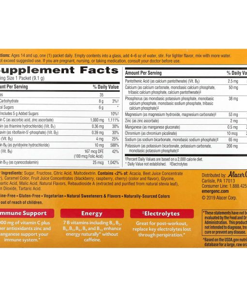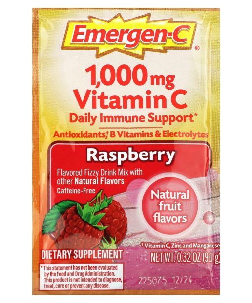 Antioxidants†, B Vitamins & ElectrolytesFlavored Fizzy Drink Mix with Other Natural FlavorsCaffeine-Free, Gluten-Free, Vegetarian & Natural SweetenersNatural Fruit FlavorsAs Much Vitamin C as 10 Oranges!^Dietary SupplementFeel The Good®Naturally, It’s Good for You!It’s sweet; it’s nutritious; it’s berry-licious. In other words, it really puts the razz in raspberry. With each sip, you can feel the essential nutrients flow through your body in a wave of Emergen-C® rejuvenation. If feeling good is your thing, you found the right box.Immune Support: 1,000 mg of vitamin C plus other antioxidants zinc and manganese support your immune system.Energy: 7 B vitamins including, B1, B2, B3, B5, B6, B9 and B12 enhance energy naturally without caffeine.‡Electrolytes: Great for post-workout, replace key electrolytes lost through perspiration.†Vitamin C, Zinc & Manganese.^Based on the USDA.gov nutrient database for a large, raw orange.