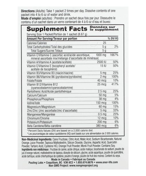 Non-Medicinal Ingredients: Cane fructose, citric acid, malic acid, sodium bicarbonate, natural orange juice powder, tapioca maltodextrin, silicon dioxide, glycine, aspartic acid, quercetin powder, tartaric acid, cysteine HCl, orange fruit powder, monk fruit powder.Contains soy.