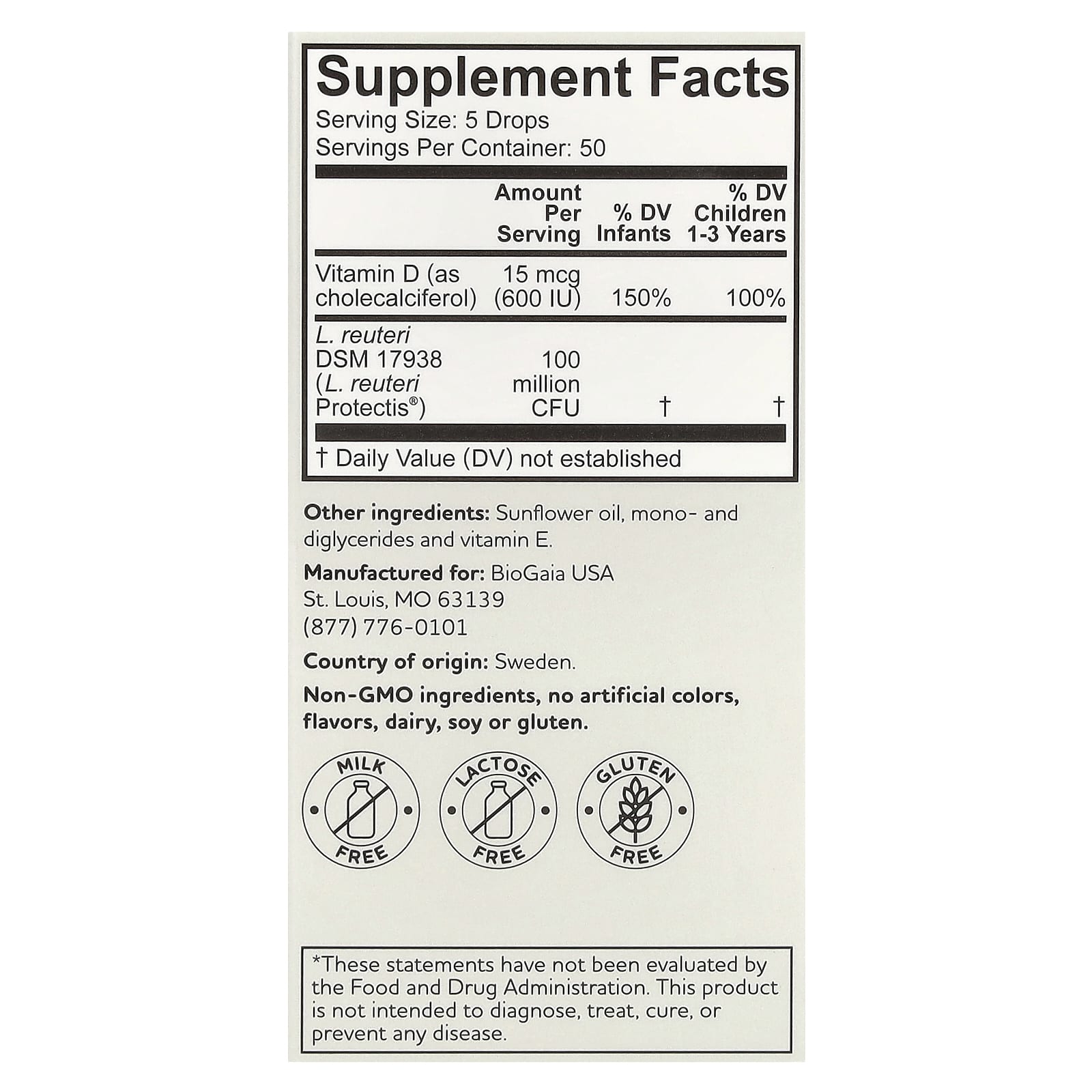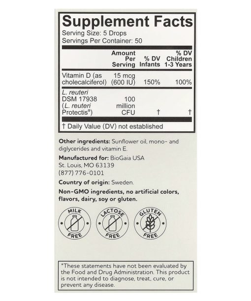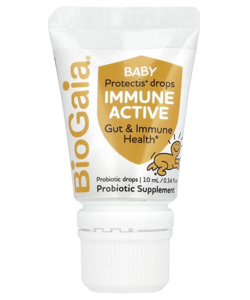 Gut & Immune HealthClinically ProvenProbiotic Drops600 IU Vitamin D3Probiotic Supplement Milk FreeLactose FreeGluten Free Groundbreaking Probiotics Driven by ScienceCountry of Origin: Sweden Probiotic Baby CareProbiotic drops with vitamin D3 BioGaia® Protectis® BABY drops Immune Active is a dietary supplement containing the patented probiotic Limosilactobacillus reuteri Protectis® (L. reuteri DSM 17938) and vitamin D3 that contributes to the normal function of the immune system. L. reuteri Protectis helps the good guys keep a natural balance in the gut and has been tested in more than 150 clinical trials and proven safe & effective for children.