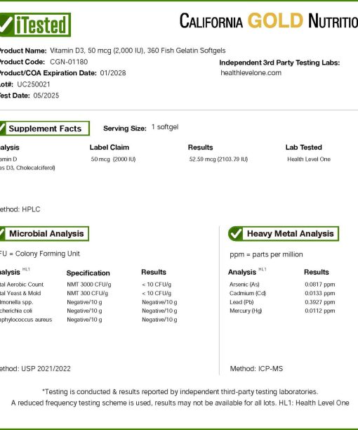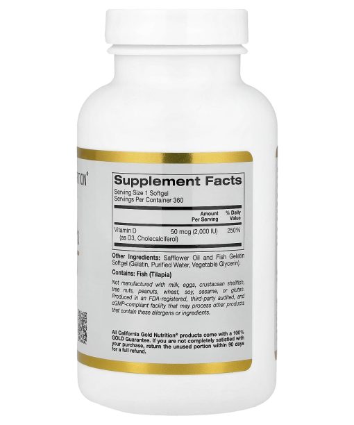 Featuring Vitamin D3 (Cholecalciferol)Supports Healthy Bones and Teeth* Supports Healthy Immune System Function*California Gold Nutrition® Vitamin D3, 50 mcg (2,000 IU) is a vitamin D supplement as cholecalciferol in fish gelatin softgels.iTested Verified