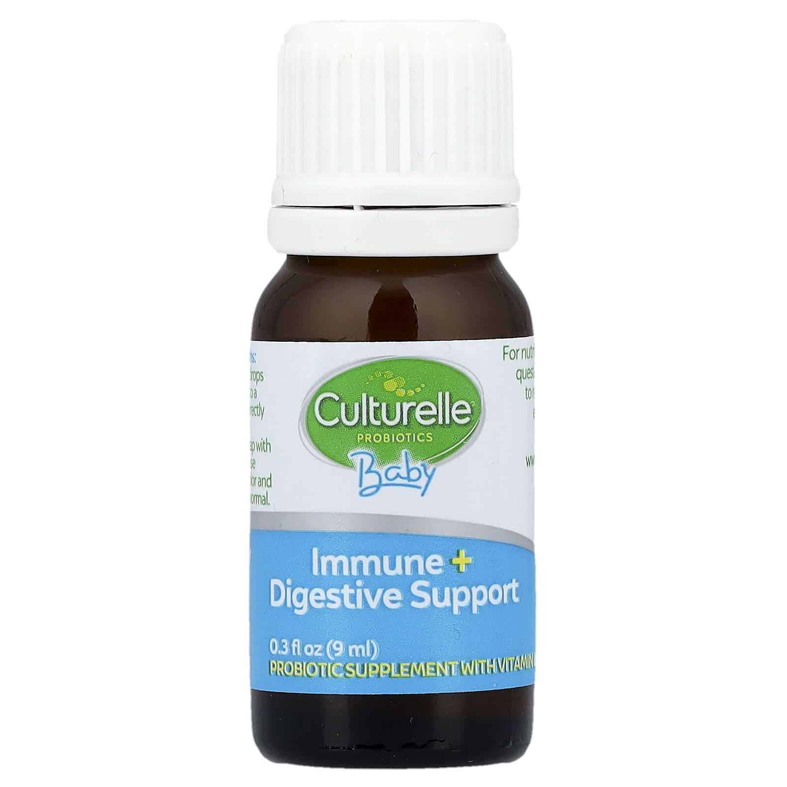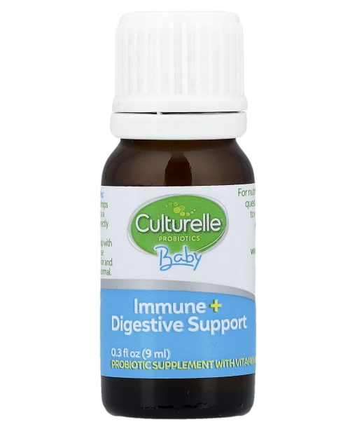 #1 Pediatrician Recommended Brand♦Probiotic Supplement with Vitamin DNo Artificial ColorsNon GMOHelps Support:Immune & Digestive HealthBetter Nutrient AbsorptionStrong BonesCulturelle® Baby Immune + Digestive Support Probiotic & Vitamin D Drops helps your baby build a strong foundation of health & promotes healthy development.With 400 IU of vitamin D to help build strong bones & develop a healthy immune system.Contains Lactobacillus rhamnosus GG & Bifidobacterium animalis subsp. lactis (BB-12®) to support your baby’s immune & digestive health.Allergy Friendly Free FromDairyWheatGluten^SoyPeanutsEggTree Nuts♦Based on a 2021 survey among pediatricians recommending a probiotic brand.^Meets the FDA’s guidelines for gluten-free. Not a reduced calorie food.