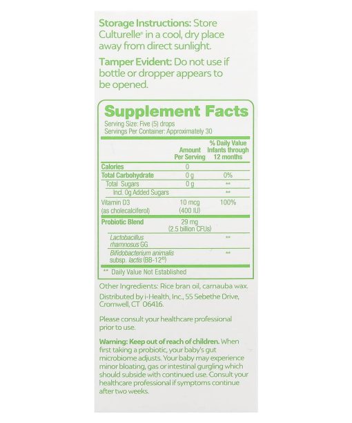 Please consult your healthcare professional prior to use.Keep out of reach of children. When first taking a probiotic, your baby’s gut microbiome adjusts. Your baby may experience minor bloating, gas or intestinal gurgling which should subside with continued used. Consult your healthcare professional if symptoms continue after two weeks.Storage Instructions: Store Culturelle® in a cool, dry place away from direct sunlight.Tamper Evident: Do not use if bottle or dropper appears to be opened.