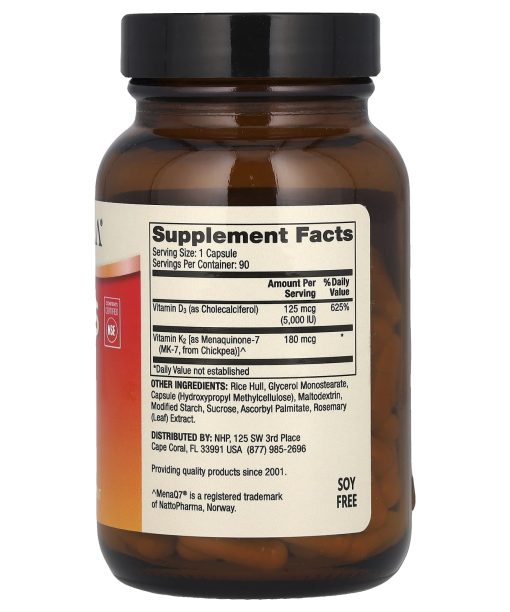 5,000 IU Vitamin D3 Per Capsule180 mcg Vitamin K2 (MK-7) Per CapsuleContents Certified NSFDietary Supplement Soy FreeProviding quality products since 2001.Researchers are discovering that Vitamin D may be the most important nutrient ever discovered for supporting immune health.Regulating the expression of more than 900 genes in your body, vitamin D3 influences just about every function, including healthy cell development and growth, strong bones, cardiovascular health, brain health and cognition. However, supplementing with just vitamin D isn’t enough.When you take vitamin D, it is vitally important to also get enough vitamin K2. Not only do the two vitamins work synergistically, vitamin D needs vitamin K2 to function properly. Taken together, vitamins D3 and K2 support your overall heart health, arteries and veins, bone health, and respiratory and immune systems.