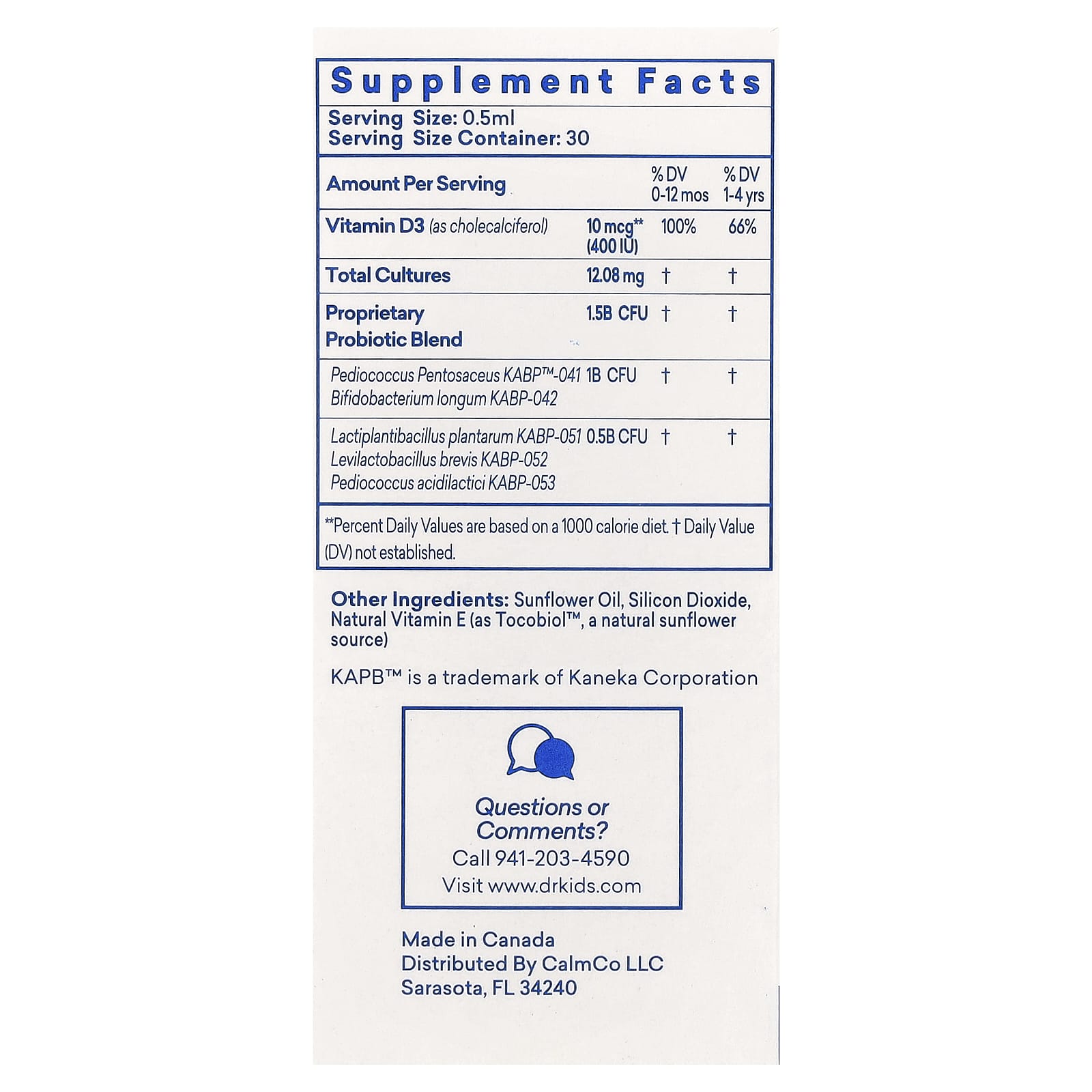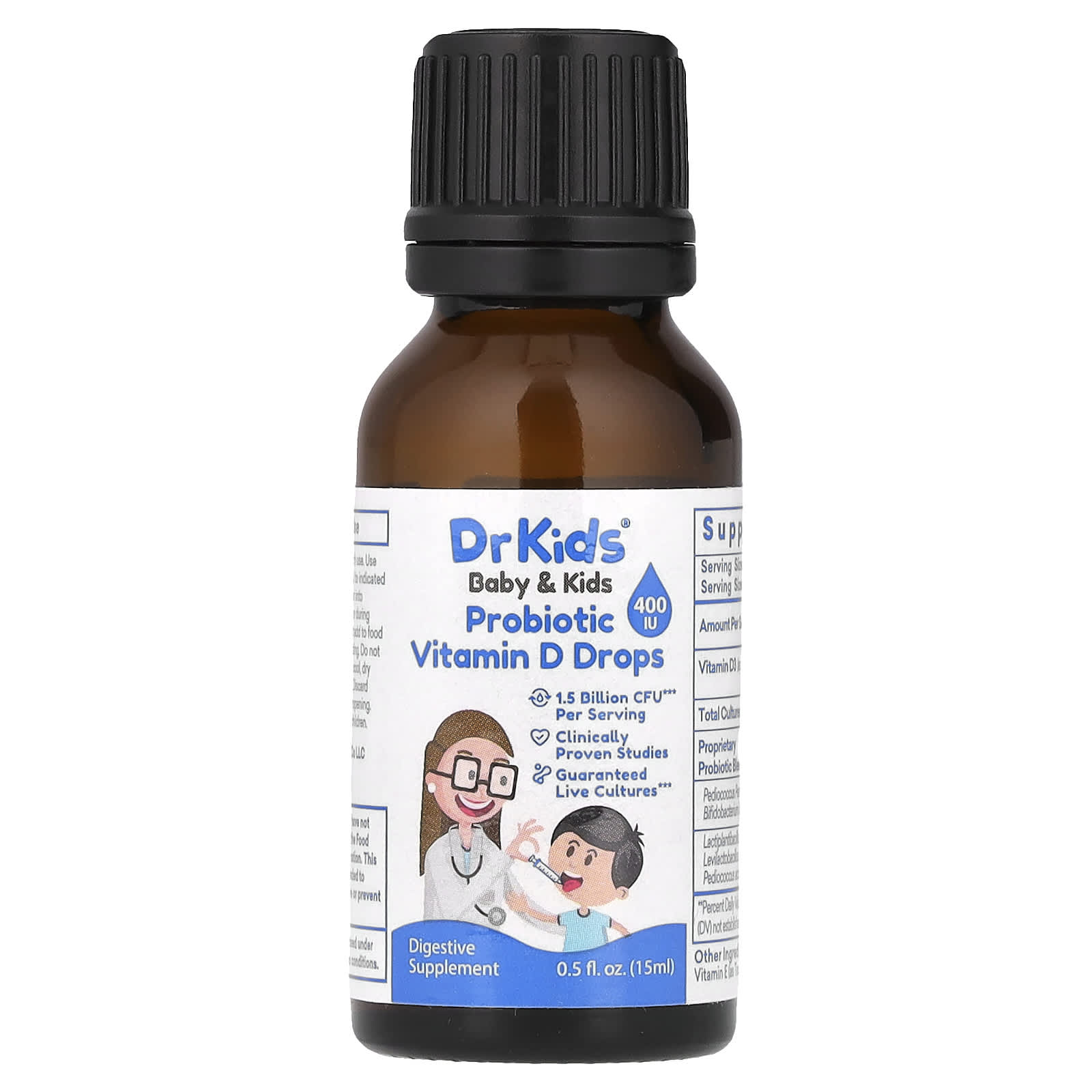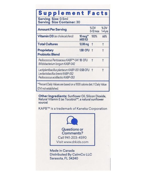 5-Strain Formula400 IU 1.5 Billion CFU*** Per ServingClinically Proven Studies Guaranteed Live Cultures***Digestive Supplement Guaranteed Live Cultures ***Daily Support for Digestive Health May Support Colic Relief May support gut and digestive health for powerful immune support. Proprietary blend of probiotics ideal for babies and children *** Cultures guaranteed under indicated optimum conditions.
