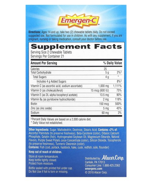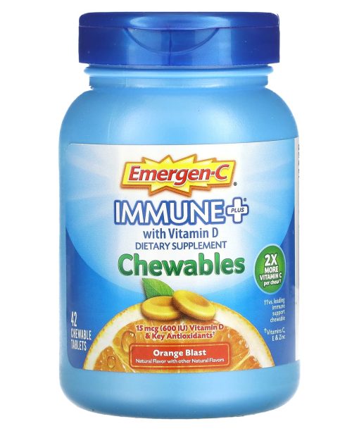 Dietary SupplementChewables2X More Vitamin C Per Chew††15 mcg (600 IU) Vitamin D & Key Antioxidants†Natural Flavors with Other Natural FlavorsA Burst of Flavor in Every BiteGreat For on The GoTangy Fruit BlastPower Packed For Your Good HealthFeel The Good®1. Health2X more Vitamin C per chew†† to naturally support your immune system. 2. Immune Support Recent research suggests Vitamin D plays an important role in regulating immune system function. 3. AntioxidantsZinc and Vitamins C and E are essential nutrients for maintaining a healthy antioxidant response. Superhuman Powers May Vary. Here’s something to chew on.We’ve supercharged Emergen-C Immune+ Chewables with key nutrients your (super) body needs. The power-packed formula provides more vitamin C than 10 oranges^ plusimmune-supporting Vitamin D and Zinc. And, your taste buds will be sure to power-up on the tangy Orange Blast flavor. Kapow!††vs. leading immune support chewable†Vitamins C, E & Zinc^Per Serving, based on using the USDA.gov nutrient database value for a large, raw orange.