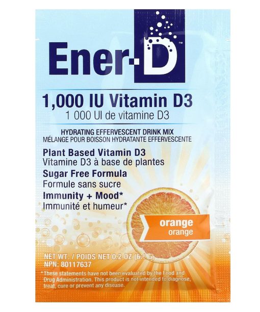 Ener-C, Ener-D, Vitamin D3, Hydrating Effervescent Drink Mix, Sugar Free, Orange, 1,000 mg, 24 Packets